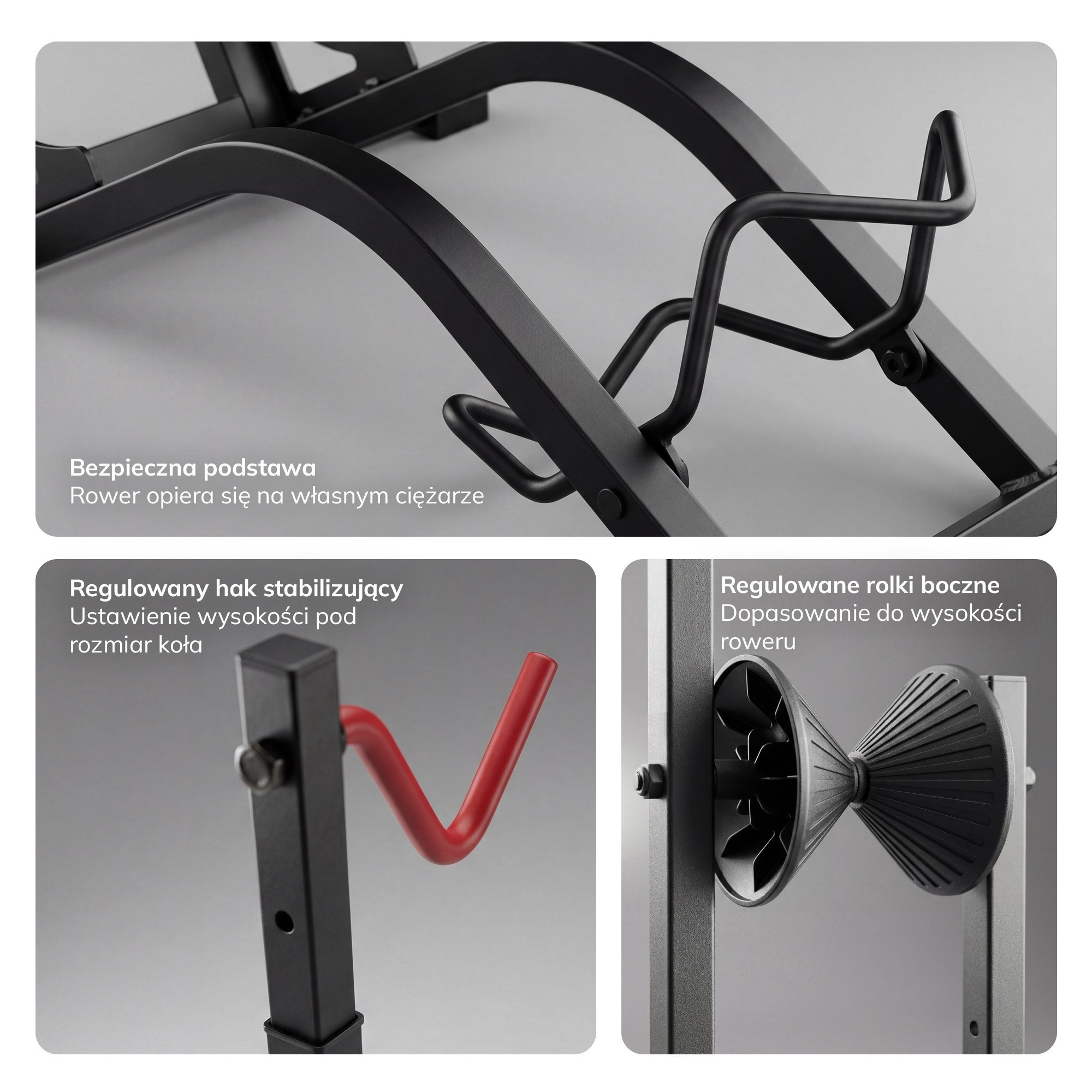 - Ochrana vašeho kola: Kontaktní body s kolem jsou opatřeny plastovými kryty, které chrání rám a kola před poškrábáním.
