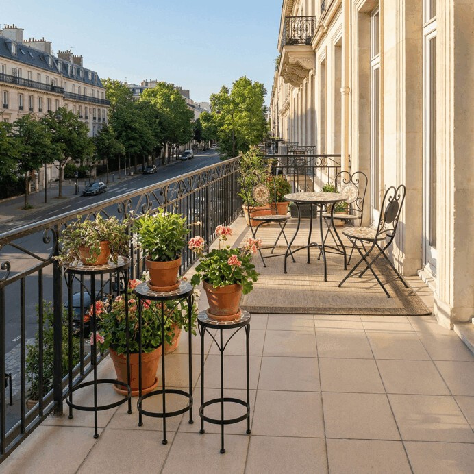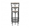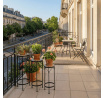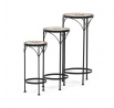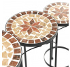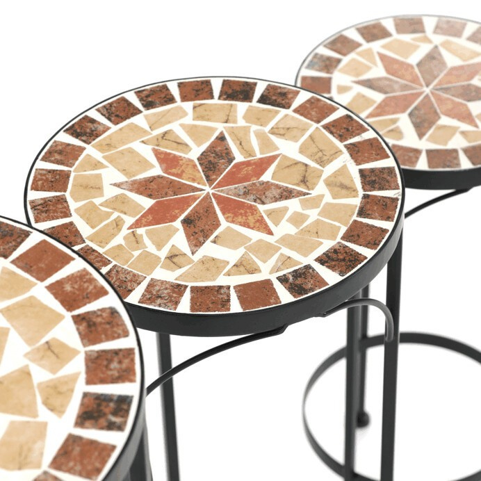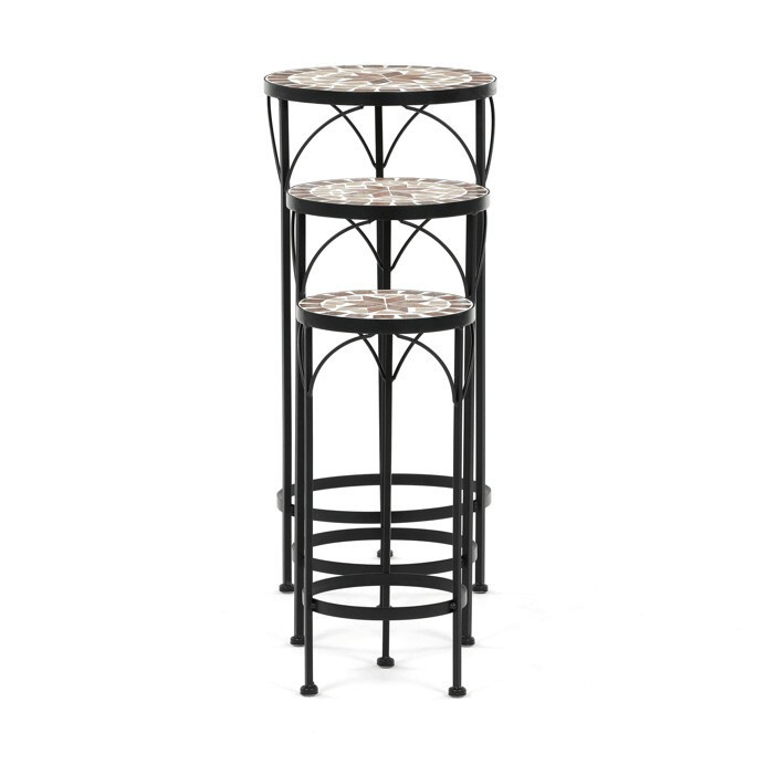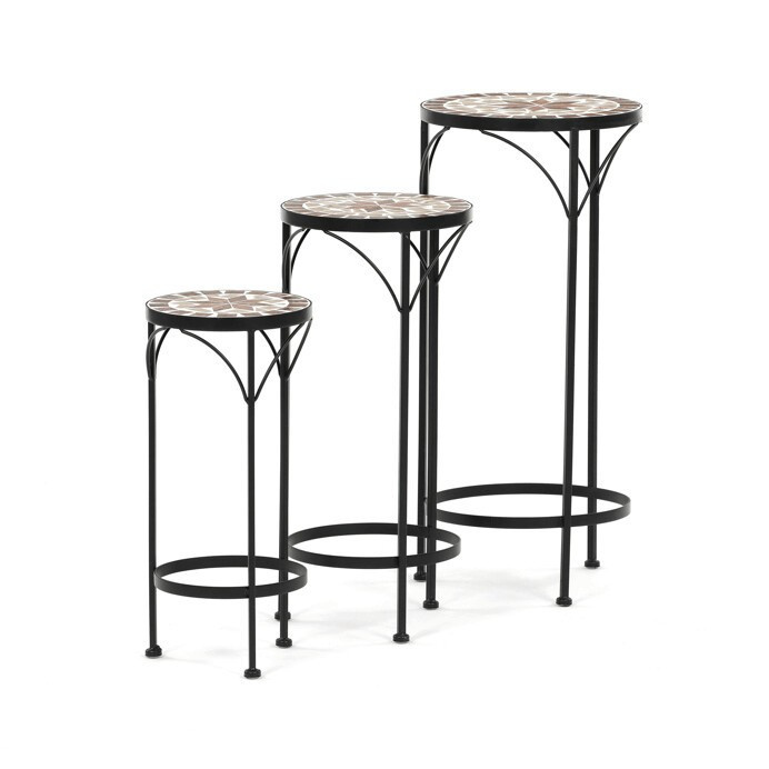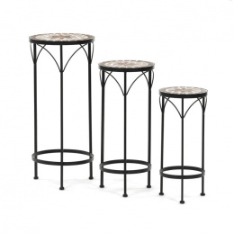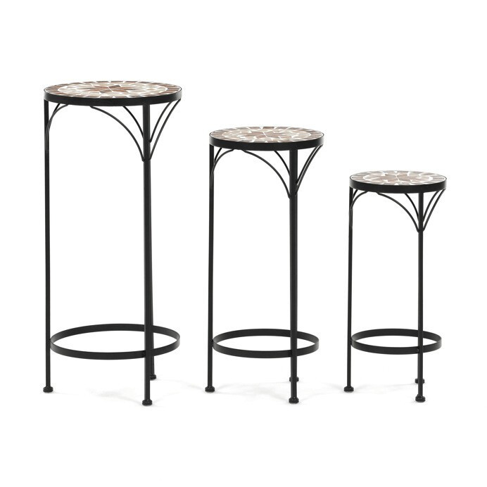 Sada tří stojanů na květiny kombinuje pevnou kovovou podnož s keramickou deskou zdobenou krémovou mozaikou, která vytváří jemný dekorativní prvek. Každý stojan má odlišnou výšku, což umožňuje variabilní uspořádání rostlin a zajímavou prostorovou kompozici. Kovová podnož je navržena pro stabilitu a dlouhou životnost, zatímco keramická deska je snadno udržovatelná a odolná vůči povětrnostním vlivům. Díky elegantnímu spojení materiálů a přírodních odstínů stojany vyniknou jak v interiéru, tak na terase či balkóně. Vhodné pro vystavení květin v různých velikostech a typech nádob.