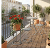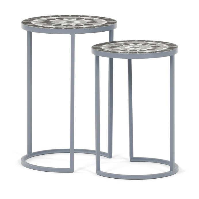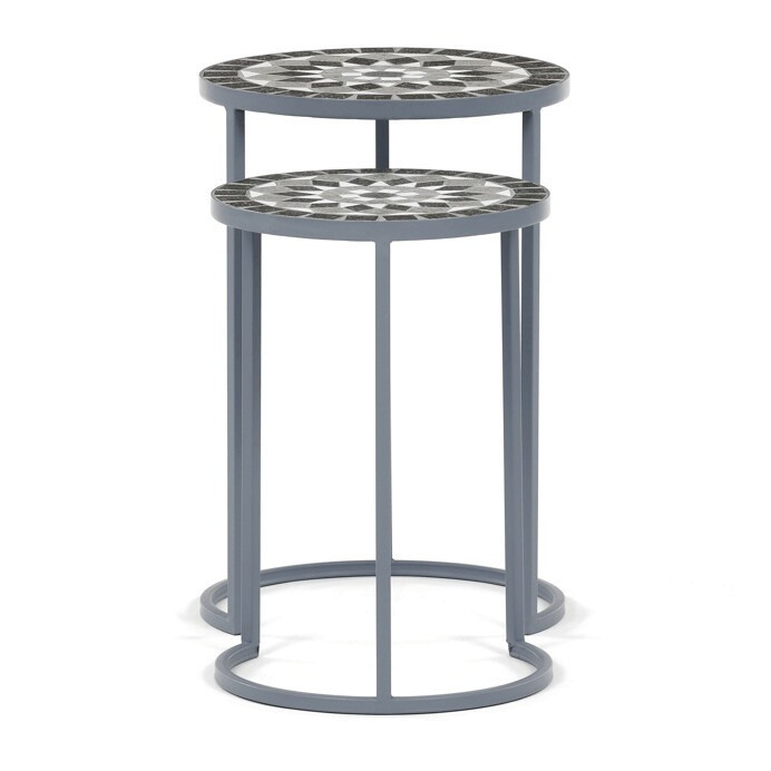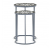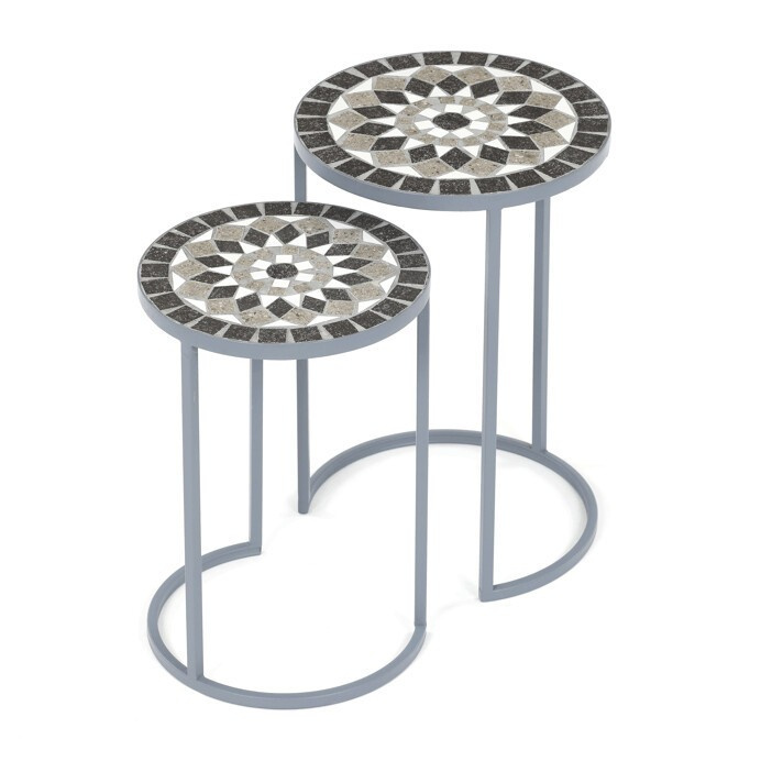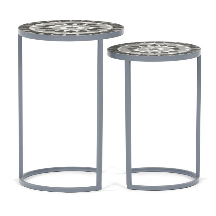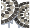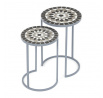 Sada dvou stojanů na květiny v šedém provedení kombinuje pevnou kovovou konstrukci s dekorativní keramickou deskou s mozaikovým vzorem. Kulaté desky zdobí geometrický motiv v přírodních odstínech šedé a bílé, který dodává stojanům výrazný vizuální efekt. Kovová podnož je navržena tak, aby zajistila stabilitu a zároveň působila vzdušně díky otevřenému tvaru s obloukovým spodním rámem. Stojany jsou vhodné pro umístění květin nebo dekorativních předmětů v interiéru i na kryté venkovní prostory. Díky různým velikostem lze stojany kombinovat a vytvořit tak zajímavou kompozici.