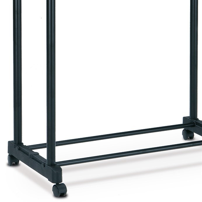 Dvojramenný stojan na šaty v černém provedení kombinuje pevný kovový rám s plastovými prvky pro stabilitu a snadnou manipulaci. Výškově nastavitelná horní tyč umožňuje přizpůsobení podle potřeby, což zajišťuje optimální využití prostoru a pohodlné zavěšení oděvů různých délek. Spodní odkladač nabízí praktické místo pro uložení bot nebo dalších doplňků. Stojan je vybaven kolečky, která usnadňují přesun v interiéru bez poškození podlahy. Kompaktní design a kvalitní materiály zaručují dlouhodobé užívání v domácnostech i komerčních prostorách.