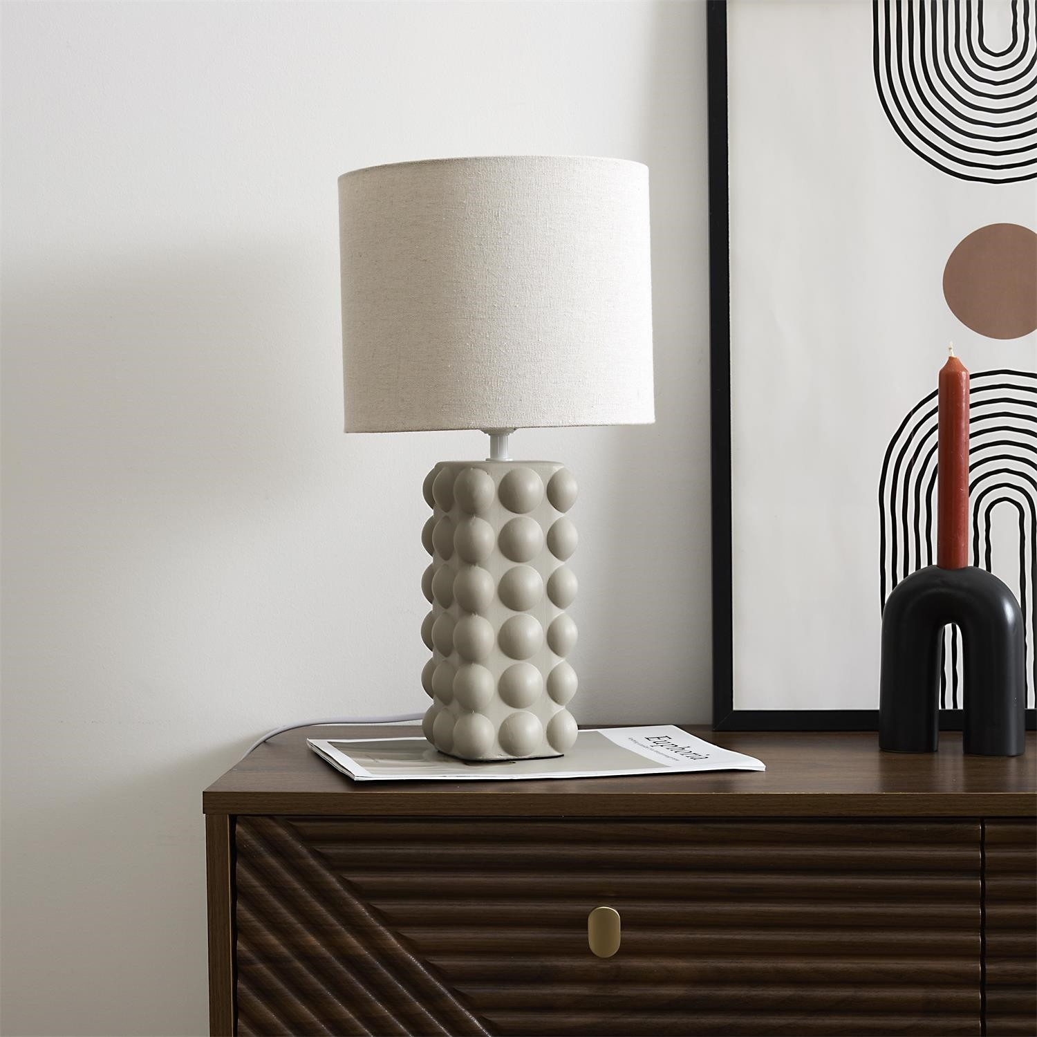 Lampička vyrobená z keramické základny a stínidla z tkaniny je ideálním prvkem výzdoby, který svým rozptýleným světlem dodá atmosféru v obývacím pokoji nebo ložnici. Lampička se závitem na žárovku E27 (není součástí balení) je vybavena kabelem o délce 120 cm s vypínačem.