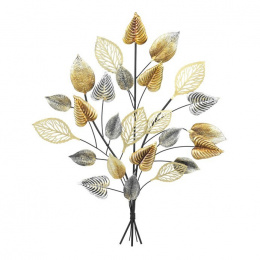 Nástěnná dekorace ve tvaru stromu je vyrobena z kovu a kombinuje zlaté, stříbrné a černé tóny listů v různých tvarech a provedeních. Jemné detaily listů, včetně perforací a reliéfních vzorů, vytvářejí zajímavou texturu a hloubku. Dekorace působí lehce a vzdušně díky tenkým větvičkám, které spojují jednotlivé listy do kompaktního celku. Vynikne na stěně v obývacím pokoji, chodbě nebo kanceláři a dodá prostoru stylový a moderní akcent. Je vhodná pro zavěšení pomocí zadní úchytky.