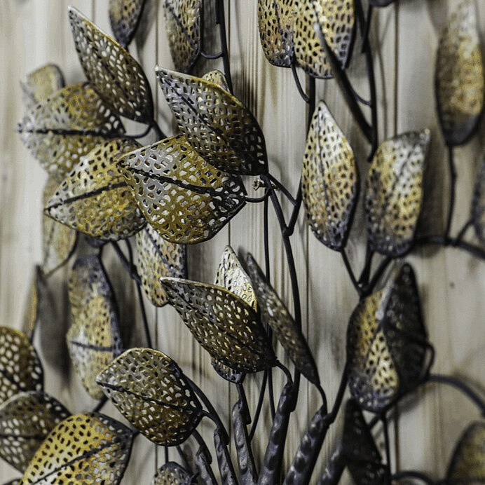Nástěnná dekorace ve tvaru stromu je vyrobena z kovu s povrchovou úpravou v zlaté barvě, která dodává prostoru teplý a luxusní vzhled. Špičaté lístky jsou detailně zpracované a vytvářejí zajímavou texturu a hloubku, díky čemuž dekorace vynikne na jakékoliv stěně. Je vhodná pro zavěšení v obývacím pokoji, chodbě nebo kanceláři, kde podtrhne styl interiéru a přinese přírodní motiv v moderním provedení. Kovové tělo zajišťuje pevnost a stabilitu celé dekorace. Rozměry a tvar umožňují snadné umístění i na menší plochy.