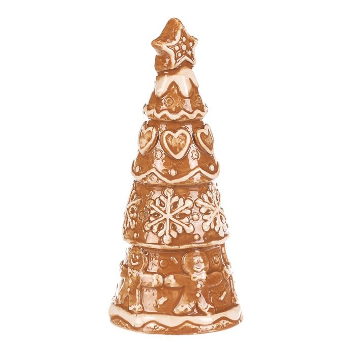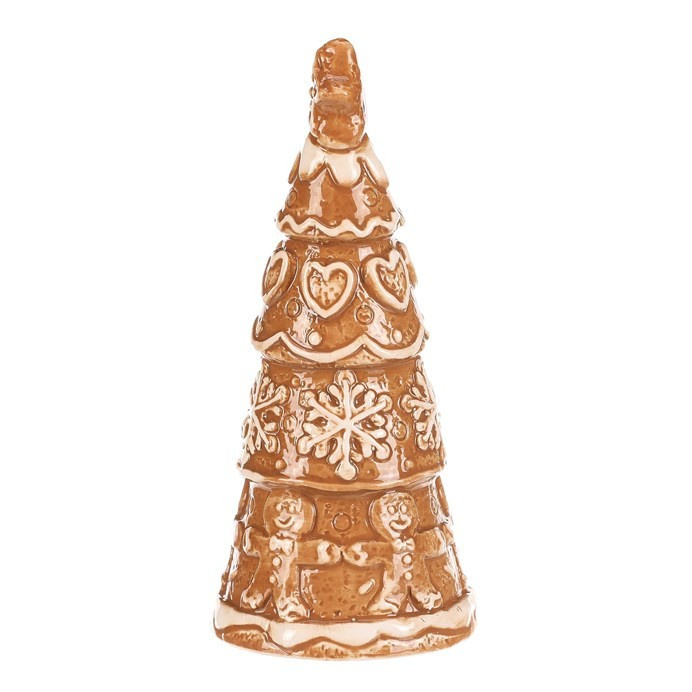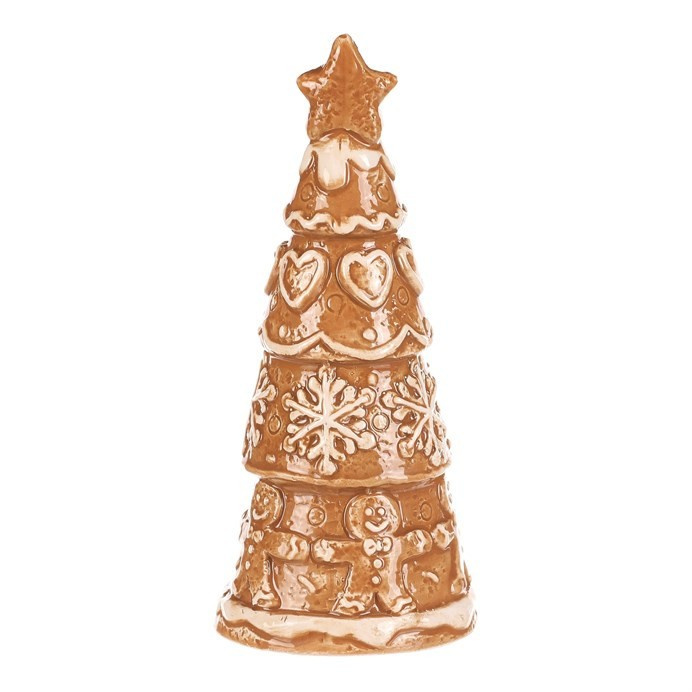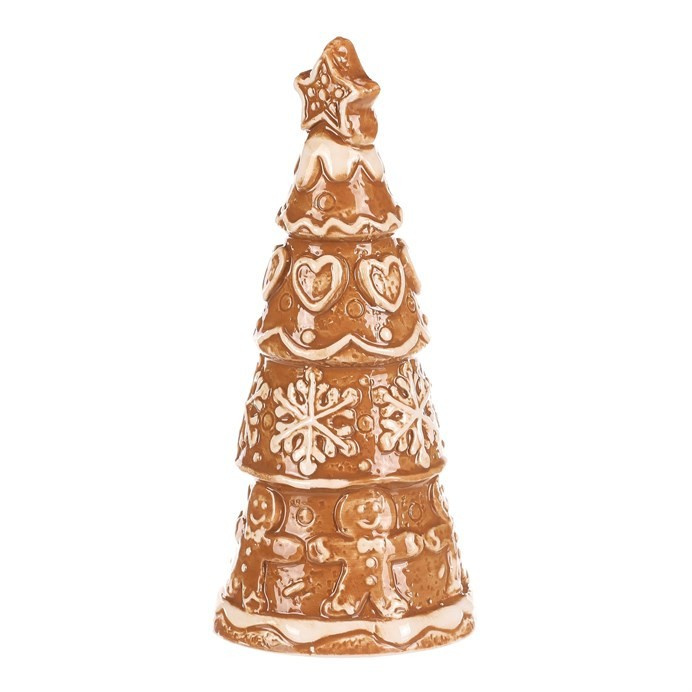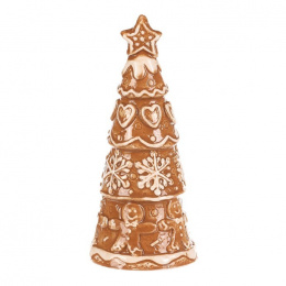 Keramický perníkový stromek s hvězdou na špici vypadá jako opravdová vánoční lahůdka. Hnědý povrch s bílou polevou zdobí roztomilá srdíčka, sněhové vločky a panáčci, což mu dodává pohádkový vzhled. Skvělá dekorace, která přinese kouzlo Vánoc do každého prostoru.