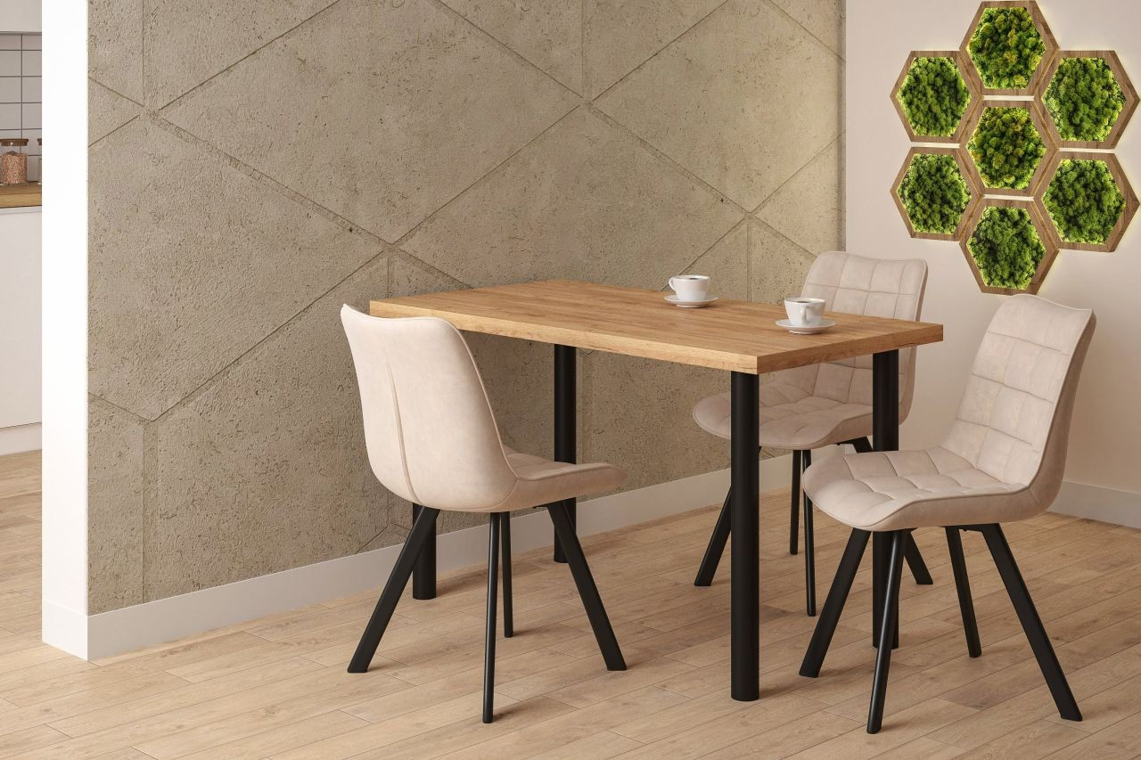 Rozměry: - délka: 101 cm - šířka: 67 cm - výška: 75 cm - tloušťka desky: 3,8 cm Materiál: - deska: laminovaná deska - hrany desky: zakončené ABS plastem - nohy: ocel lakovaná práškovou barvou Barva: - deska: dub artisan - nohy: černá