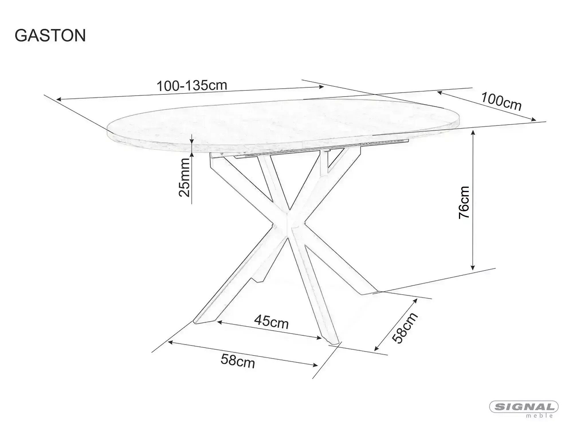 Stůl Gaston má výšku 75 cm, což je standardní výška pro pohodlné sezení. Jeho průměr 100 cm zajišťuje dostatek prostoru pro pohodlné stolování, aniž by zabíral příliš mnoho místa ve vašem pokoji. Po rozložení na 135 cm poskytuje dostatek místa pro větší skupiny, což z něj činí ideální volbu pro každou příležitost.