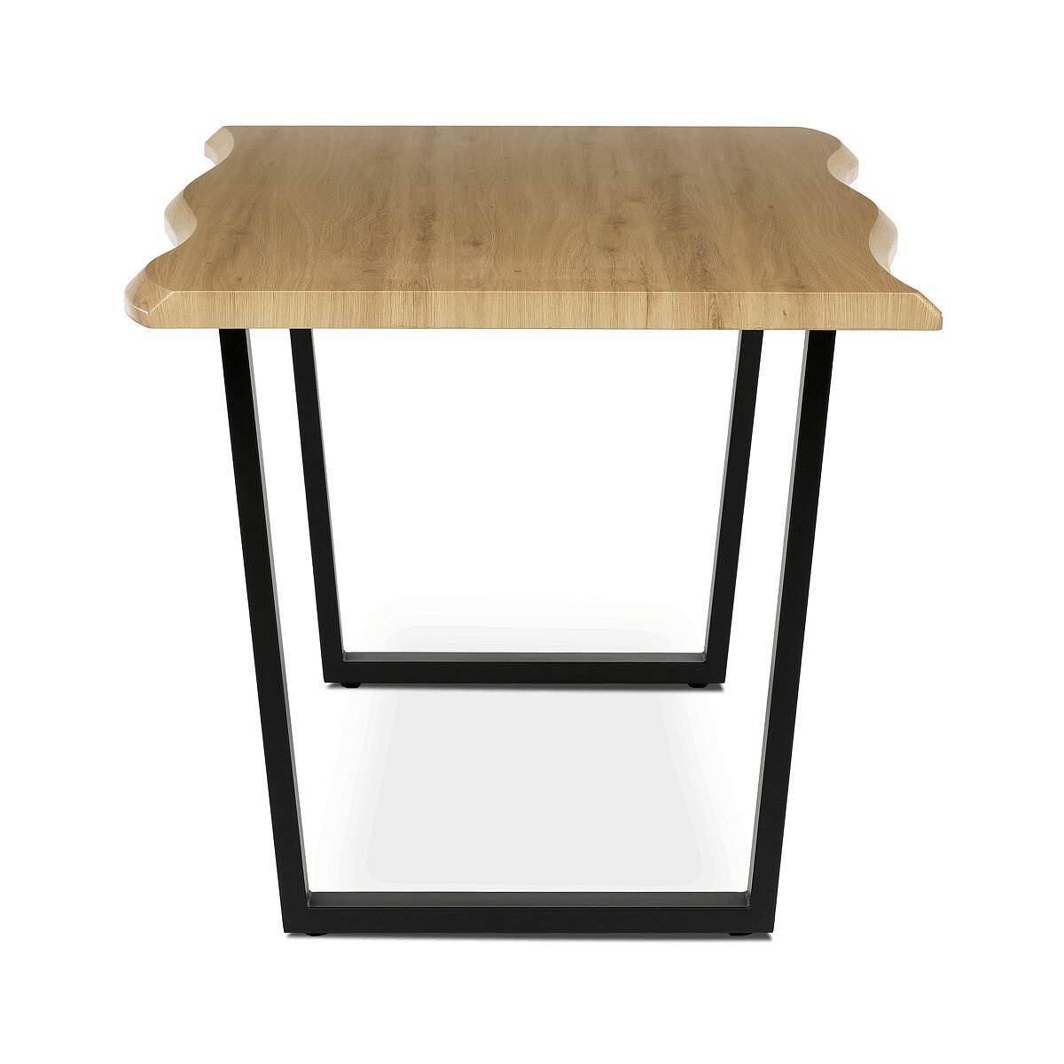 Jídelní stůl značky Autronic v industriálním stylu přinese do vaší jídelny výrazný designový prvek. Deska stolu v dekoru divokého dubu nabízí atraktivní strukturu a odolnost díky kvalitní MDF. Působivý vzhled je podtržen černými kovovými nohami, které poskytují stabilitu a vytvářejí moderní kontrast k odstínu divokého dubu desky. Atypický tvar desky dodává stolu originalitu, zatímco jeho pevná konstrukce zajišťuje dlouhou životnost. Tento stůl je ideální pro milovníky designu, kteří hledají spojení funkčnosti a stylu.