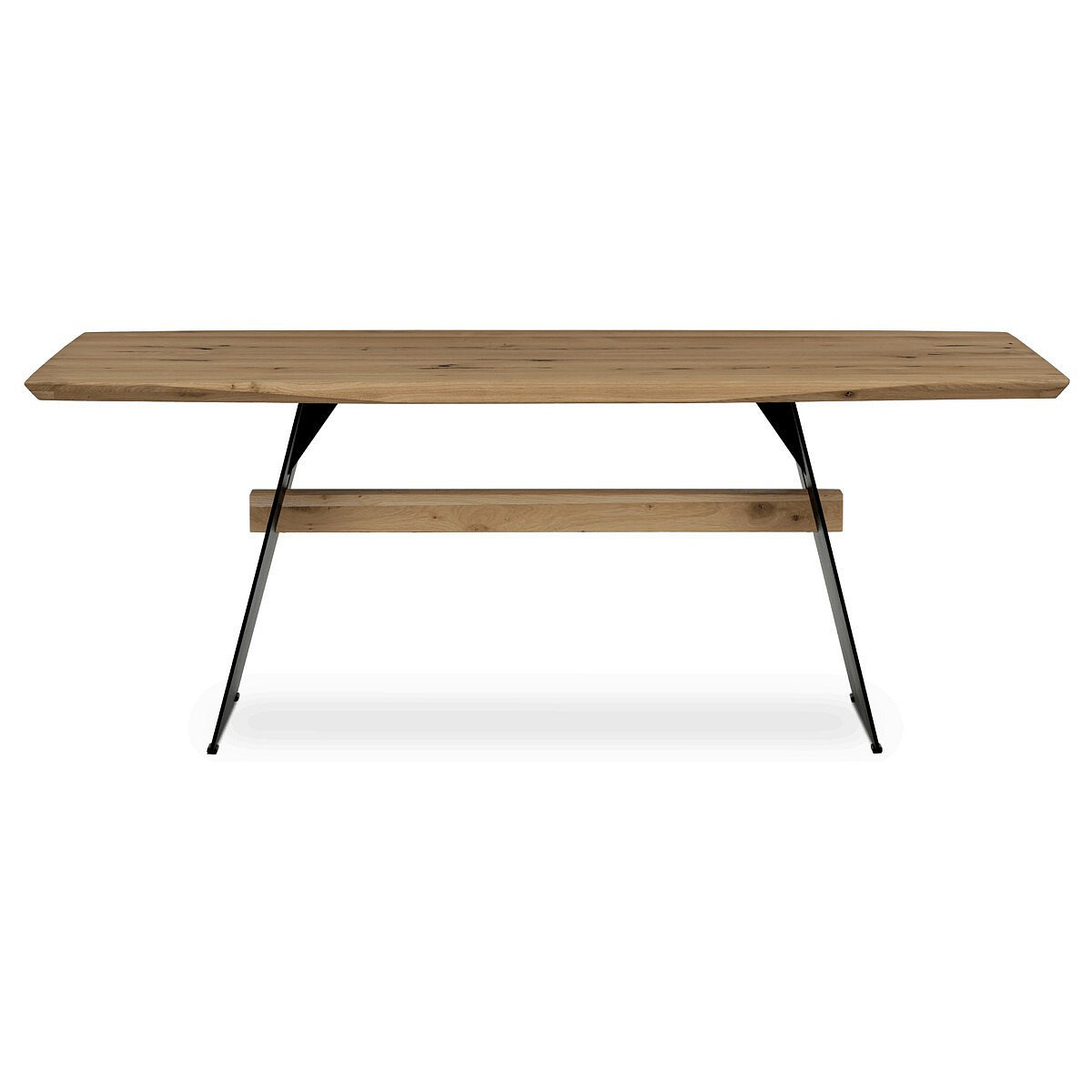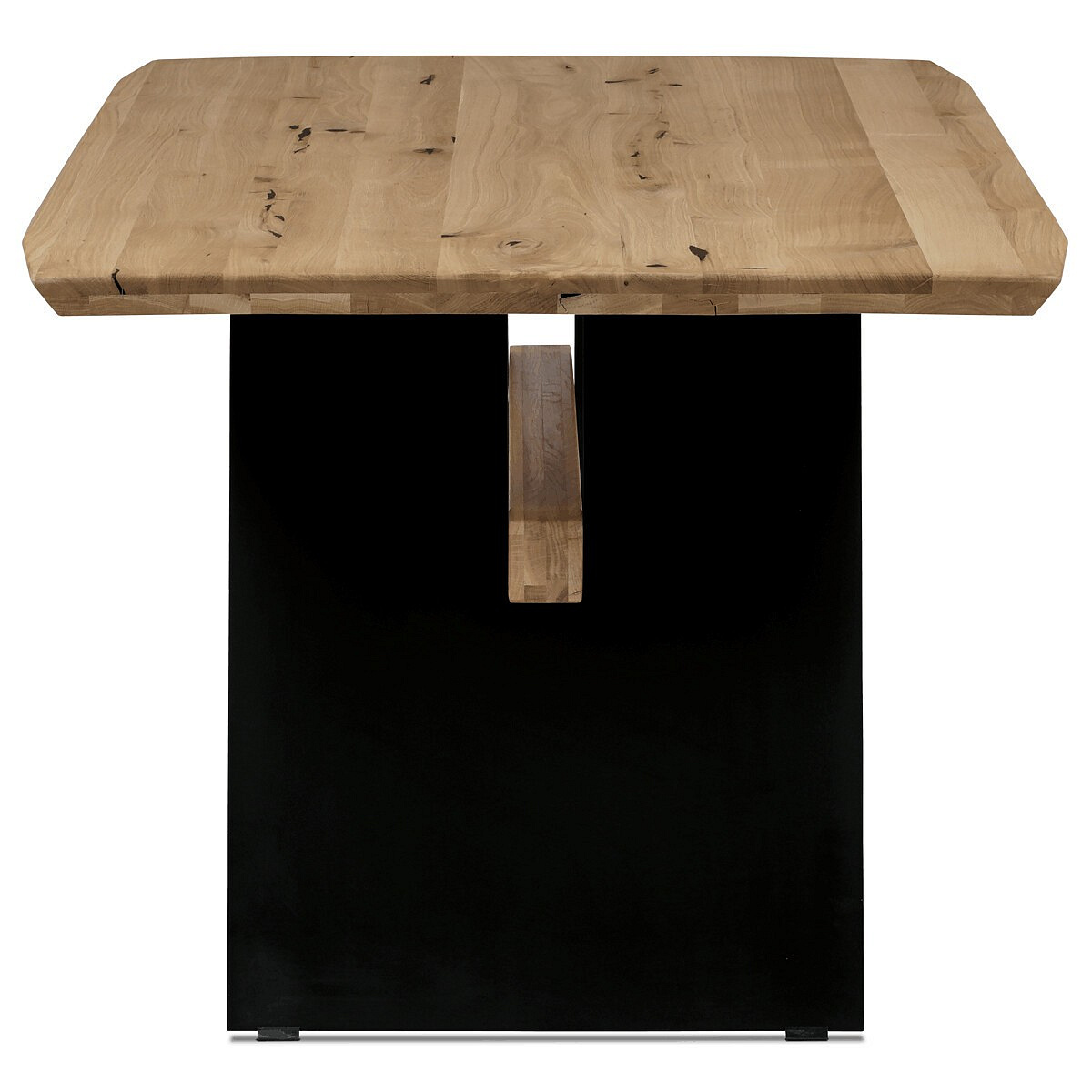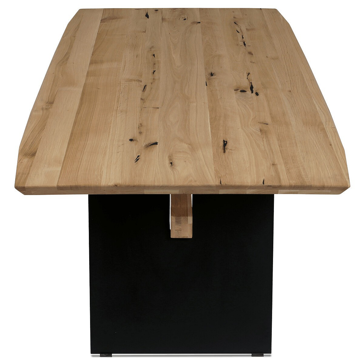 Jídelní stůl o rozměrech 200x100x75 cm kombinuje masivní dubovou desku s olejovanou povrchovou úpravou a stabilní kovovou podnoží v černé barvě. Masivní dubová deska v přírodním odstínu nabízí výraznou strukturu dřeva s viditelnými letokruhy a suky, které podtrhují autentický charakter materiálu. Olejovaný povrch zajišťuje ochranu dřeva a zároveň umožňuje zachovat jeho přirozený vzhled a příjemnou strukturu na dotek. Kovová podnož je navržena tak, aby poskytovala pevnou a stabilní oporu, přičemž její černé matné provedení kontrastuje s teplým tónem dřeva a dodává celku moderní industriální nádech. Stůl je určen pro každodenní použití v jídelnách či kuchyních, kde oceníte jeho robustnost i estetickou hodnotu.