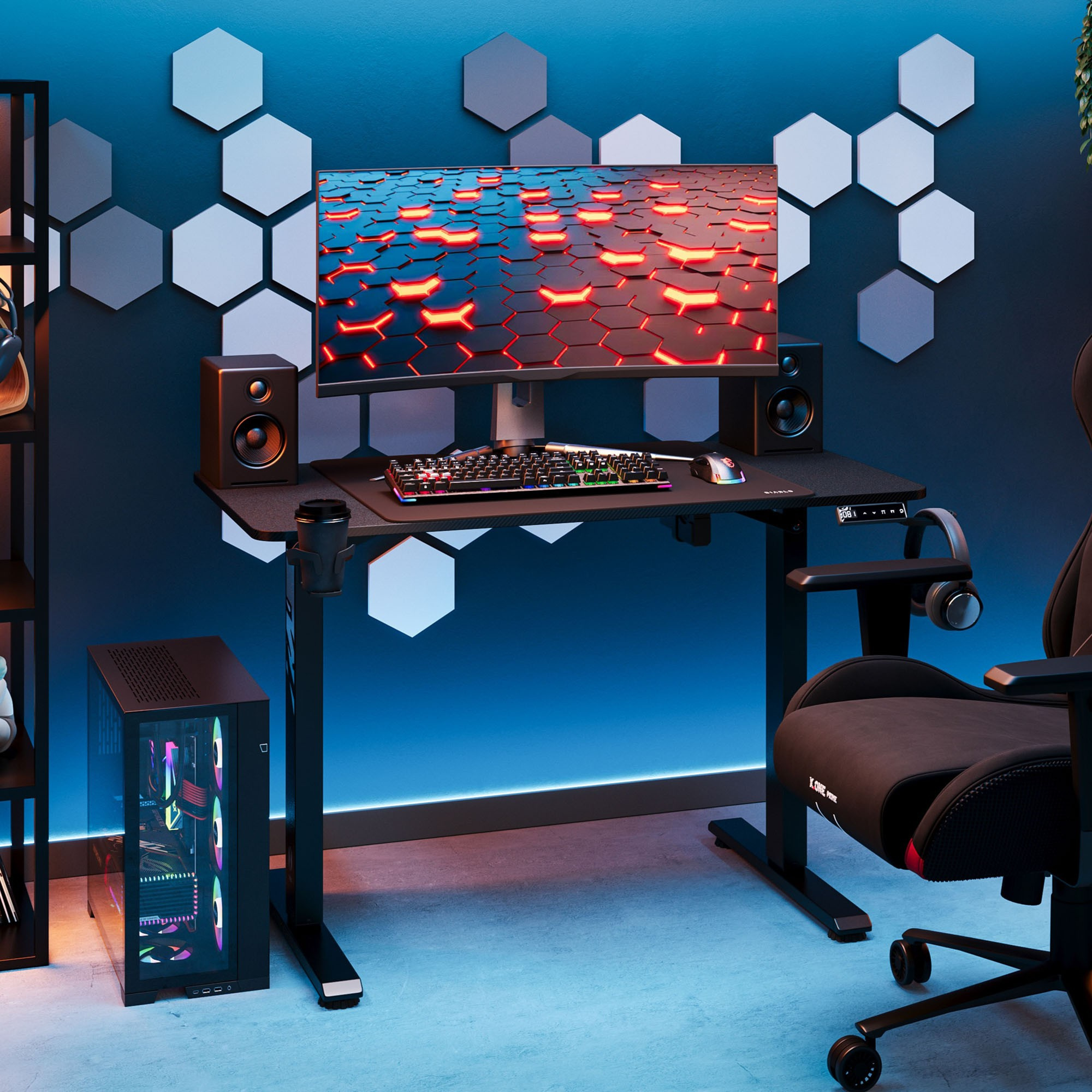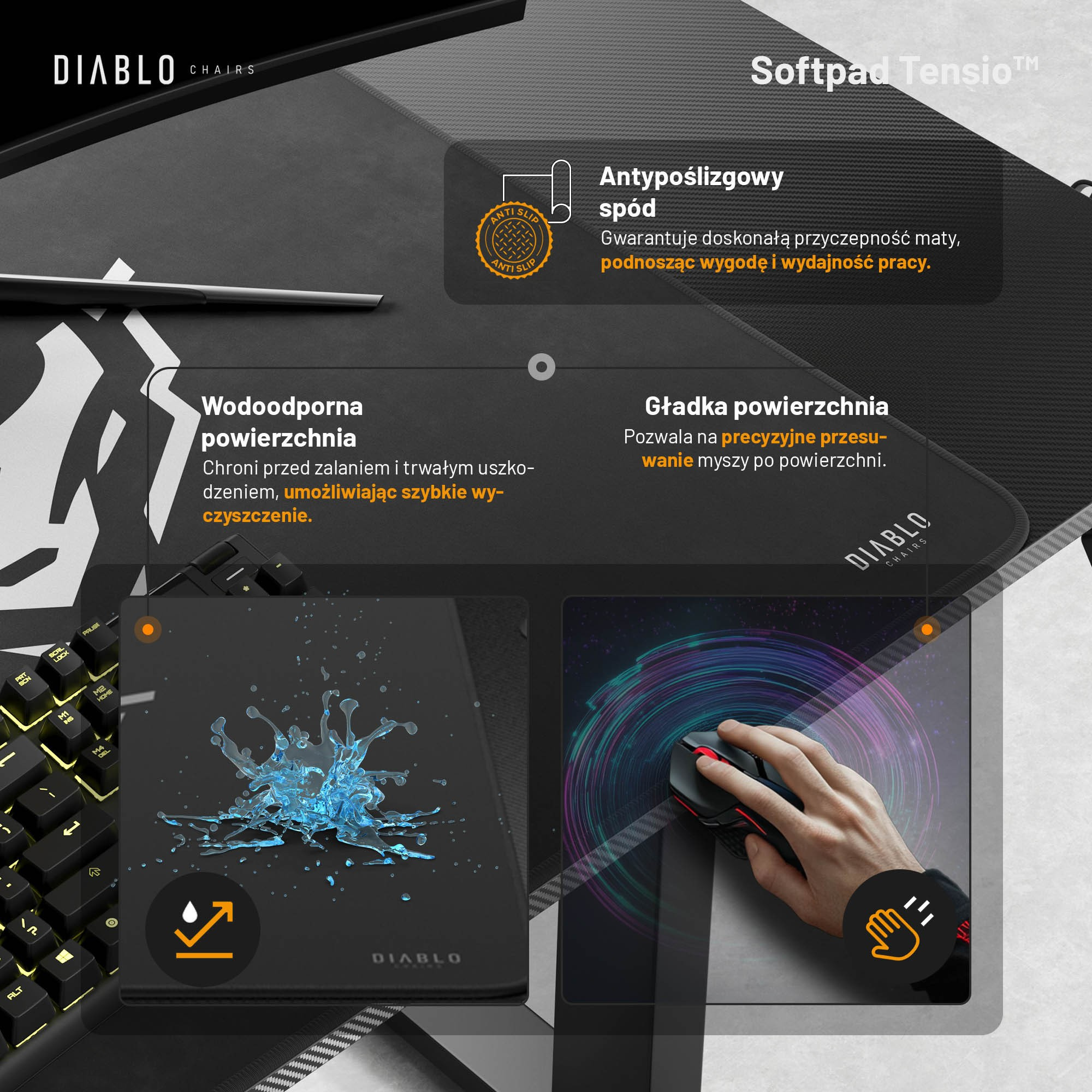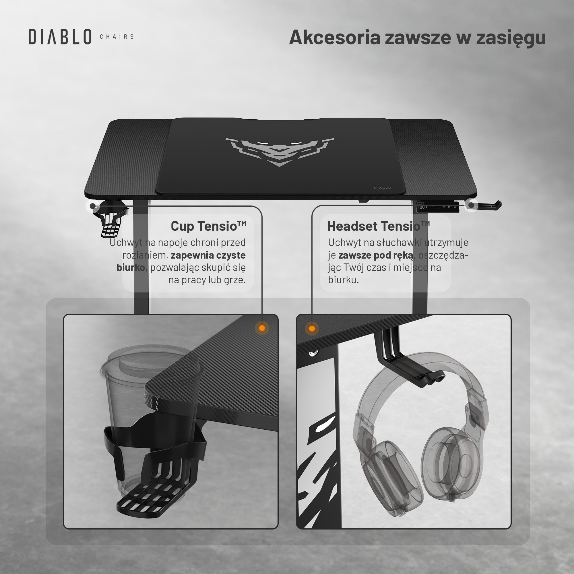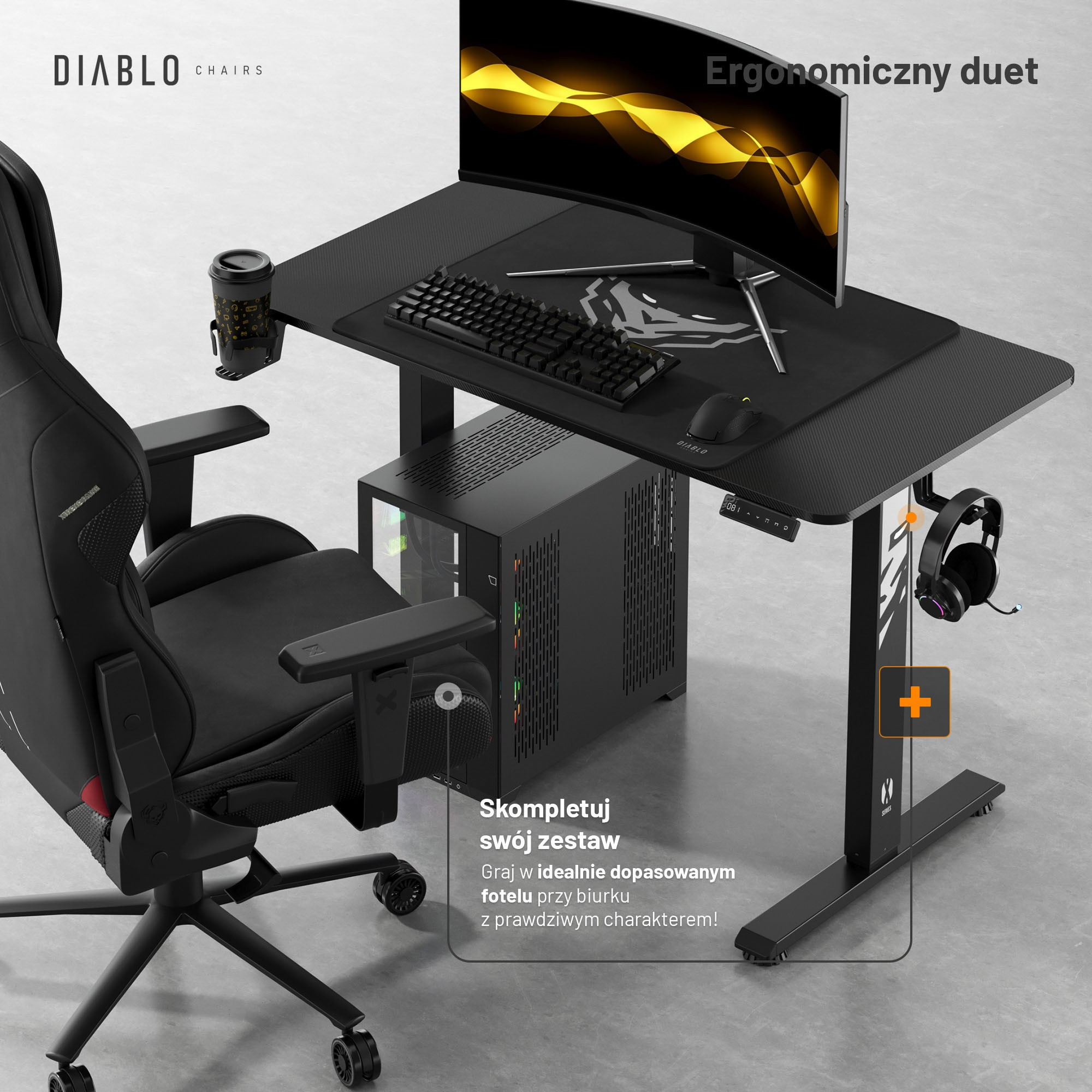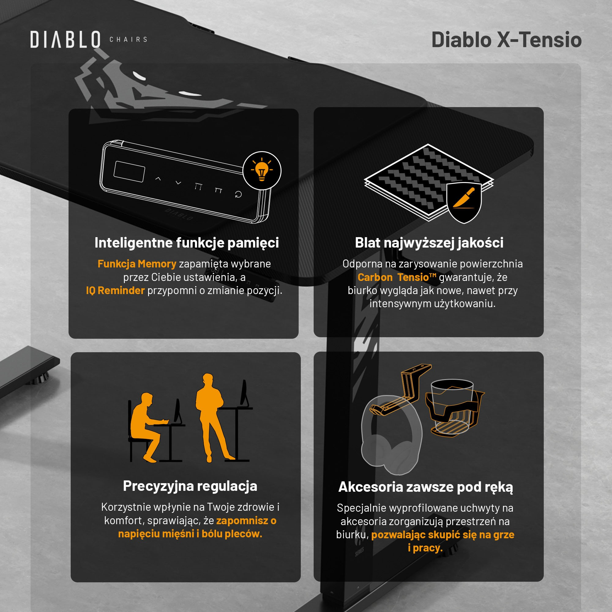 Hlavní vlastnosti STOLU X-TENSIO: Elektrické nastavení výšky umožňující sedící nebo stojící pozici Funkce Memory pro zapamatování nastavení výšky IQ Reminder připomínající změnu pozice Pohodlné držáky na sluchátka a hrnek Praktické otvory na kabely Stabilní a odolná konstrukce Deska snadno čistitelná Stůl s nastavitelnou výškou X-Tensio – pracujte podle svých pravidel Připraven na nové výzvy a zcela jiný rozměr hry nebo práce u počítače? Diablo Chairs otevírá před tebou svět, kde hodiny strávené před obrazovkou nevyvolávají bolest a nepohodlí. Stůl s nastavitelnou výškou X-Tensio byl navržen pro osoby, které chtějí spojit efektivní práci s péčí o zdraví. Nyní se můžete spolehnout na ergonomickou podporu – jak v sedě, tak ve stoje. Časté změny jsou nejlepší investicí do kondice páteře.Přesné nastavení výšky U stolu X-Tensio rozdíl dělá spolehlivý elektronický mechanismus umožňující změnu výšky desky. Můžete tedy bez námahy měnit polohu ze sedící na stojící a pracovat efektivně. Konec s bolestí zad a únavou, které brzdí Tvé výsledky! Pravidelná změna polohy příznivě ovlivňuje vaše zdraví a pohodu, což vám umožňuje soustředit se na práci.Chytrá funkce Memory a IQ Reminder Energeticky úsporný mechanismus pracuje tiše (pod 50 dB) a neruší vás při plnění úkolů. Funkce Memory si pamatuje vaše nastavení, takže snadno a rychle jedním tlačítkem přizpůsobíte výšku desky stolu. Nemusíš také hlídat, kdy změnit pozici ze sedící na stojící – můžeš zapnout možnost IQ Reminder, která ti připomene každých 30, 40 nebo 60 minut, že je čas se pohnout.Pohodlné držáky na vaše příslušenství V psacím stole Diablo X-Tensio nesmí chybět namontované držáky na hrnek a sluchátka. Oblíbené příslušenství máte vždy po ruce, bez obav z náhodného rozlití nápoje a poškození zařízení. Neztrácíš také cenné místo na stole.Organizace kabelů Máte dost pohledu na zamotané kabely? Stůl X-Tensio zkrotí nepořádek s kabely a umožní vám si s úlevou oddechnout. Speciální otvory a spony na zadní straně stolu uspořádávají kabely a skrývají je mimo dohled. Získáš ještě více místa na stole a navíc snadněji udržuješ pořádek.Prostorná deska s podložkou Diablo Deska stolu X-Tensio 1100 je mimořádně prostorná a pojme vše, co je nezbytné pro efektivní práci. Kompaktní rozměry znamenají velkou volnost při umístění stolu a uspořádání místnosti. Mata Diablo Chairs dodává dravý charakter a pomáhá v činnosti. Hladký povrch podložky usnadňuje pohyb myši – už nepotřebujete žádnou podložku. Protiskluzová spodní strana podložky zaručuje ideální přilnavost k desce stolu a voděodolné vlastnosti umožňují udržet čistý stůl.Solidní a neochvějná konstrukce Stůl s nastavitelnou výškou X-Tensio je synonymem stability. Silná podpora a odolné nohy eliminují nepříjemné kývání stolu, takže vás nic nevyruší z rytmu hry a práce. Zvedací stůl si skvěle poradí se zatížením až do 80 kg a zaoblené rohy desky dodávají dynamický design, zároveň dbají o vaše bezpečí a vylučují riziko úrazu. X-Tensio je Tvůj spolehlivý společník pro práci i zábavu na dlouhá léta.