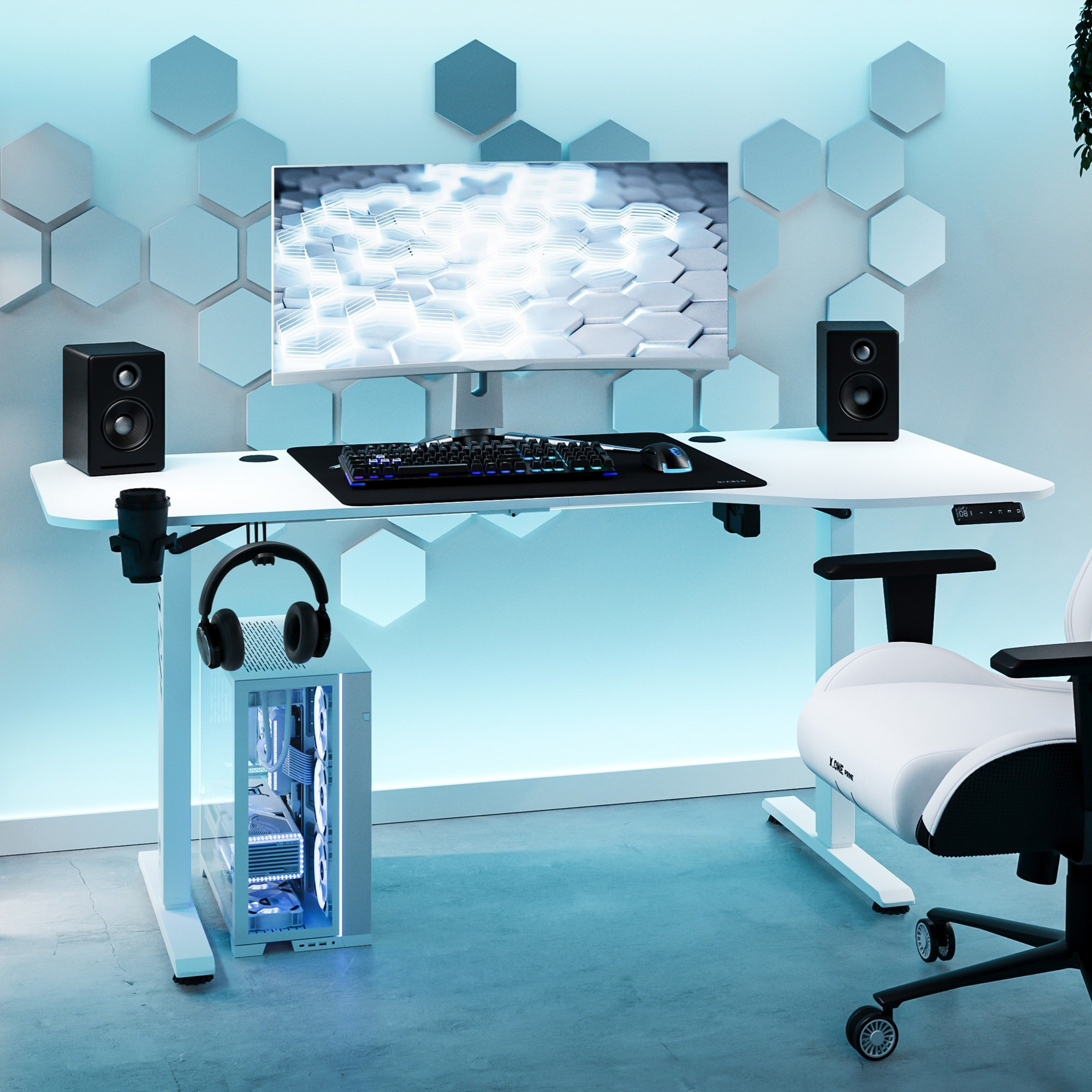 - Praktické držáky na sluchátka a hrnek: Mějte své nezbytnosti vždy po ruce a ušetřete cenné místo na stole. Už žádné rozlité nápoje a zamotané kabely!