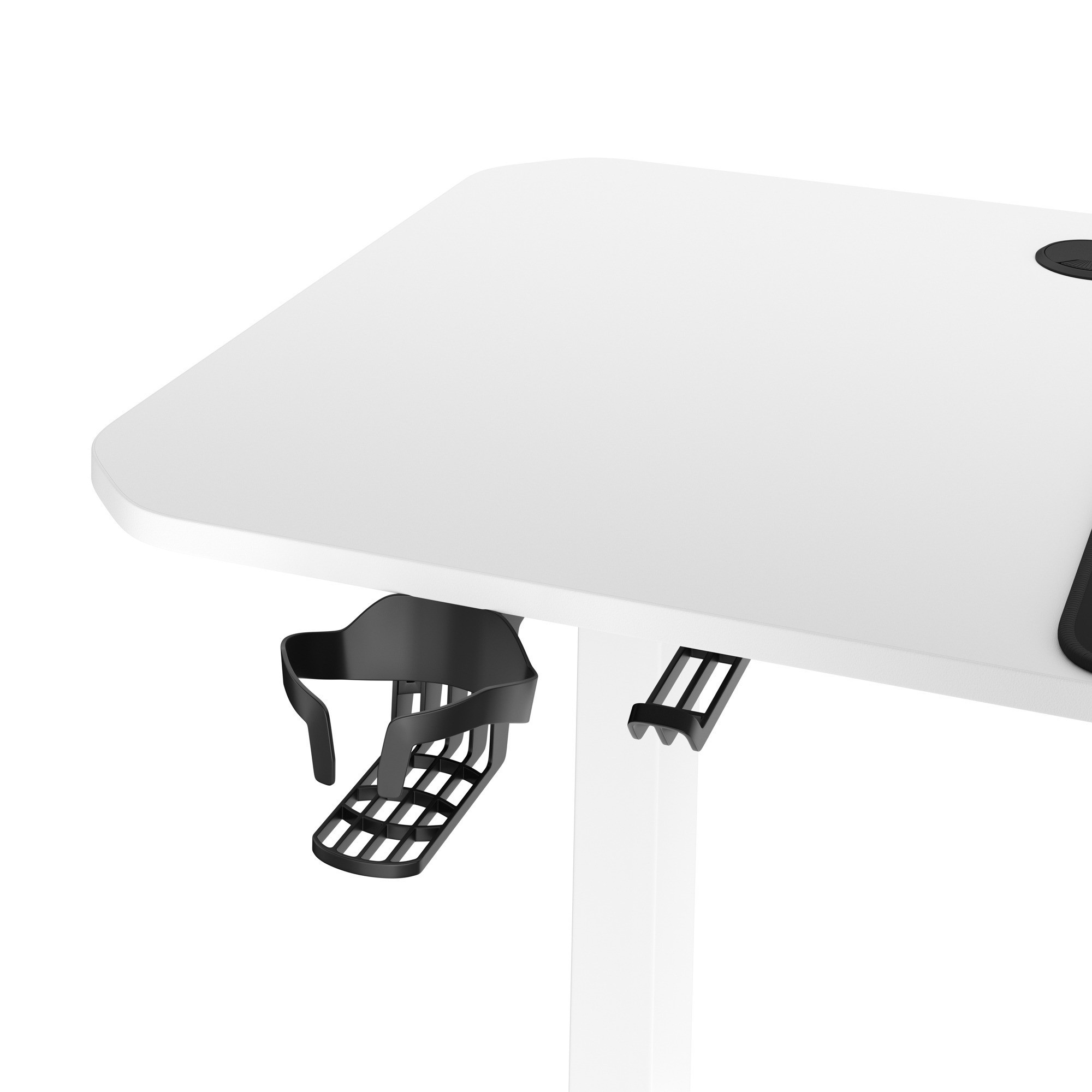 - Držáky na sluchátka a hrnek: Mějte své sluchátka a oblíbený nápoj vždy po ruce a ušetřete cenné místo na stole.