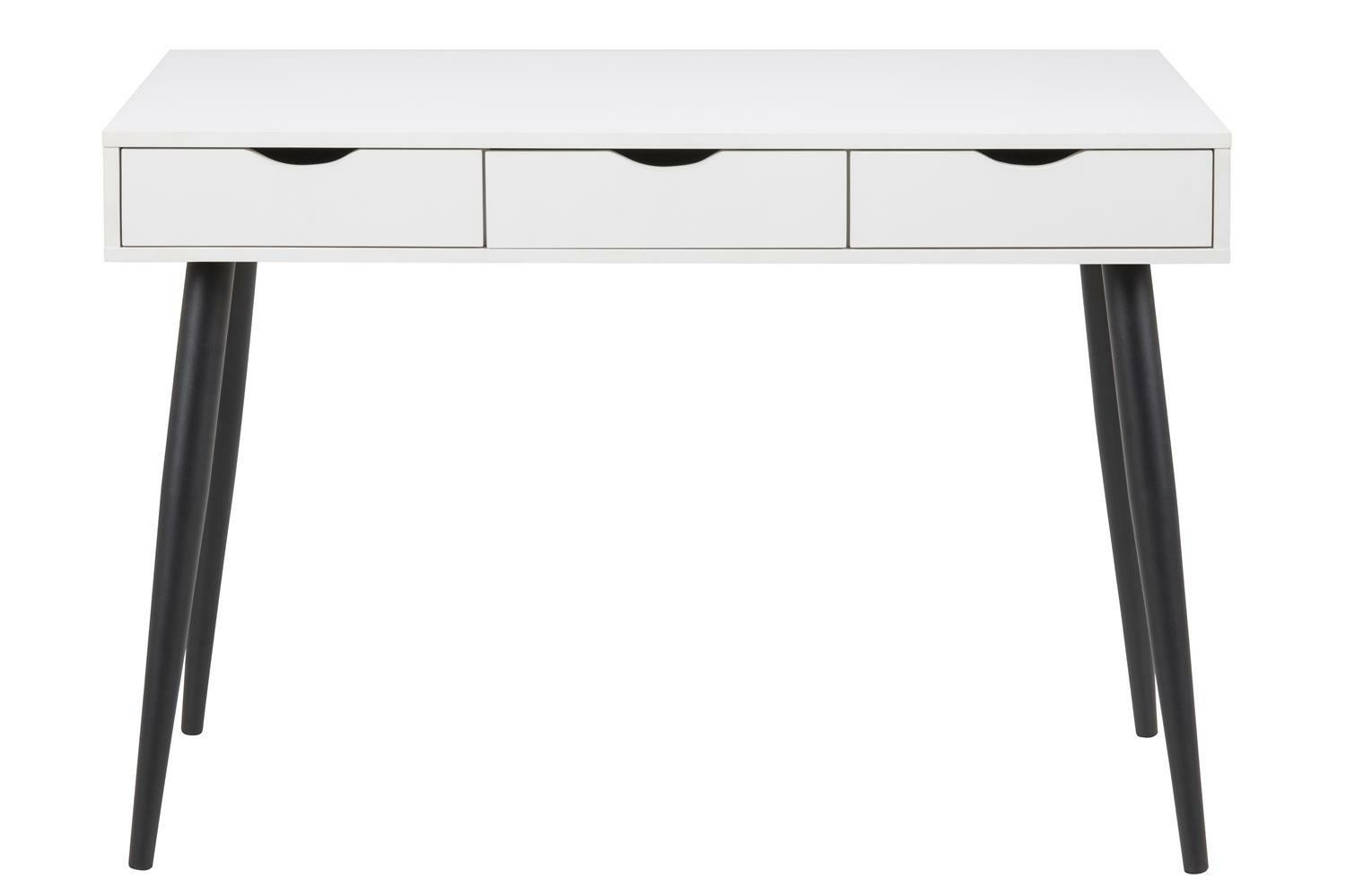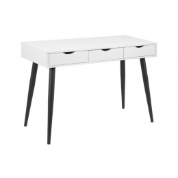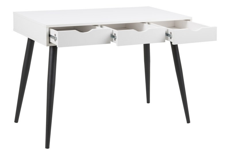 Moderní stůl Scandi bude ideálním nábytkem pro práci z domova nebo pro psaní domácích úkolů. Psací stůl byl vyroben z velmi odolné bílé melaminové desky a kovových nohou lakovaných práškovou barvou na černo. Matný povrch stolu mu dodává klasický vzhled. Stůl má 3 zásuvky, které usnadní ukládání. Jemně profilované úchyty v zásuvce jsou praktické a dodávají nábytku jemný skandinávský vzhled. Stůl o šířce 110 cm se osvědčí nejen ve velké kanceláři nebo pokoji teenagera, ale také bude skvěle vypadat v menších místnostech nebo v kancelářském koutku. Rozměry kartonů: 8x 122,5 x 67cm, 13,5 x 73x 23cm