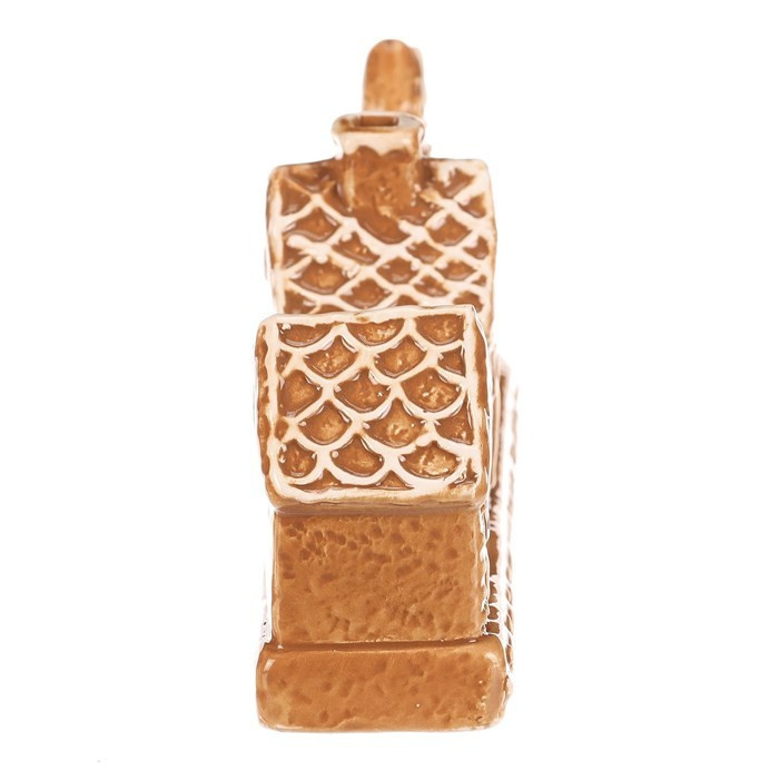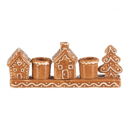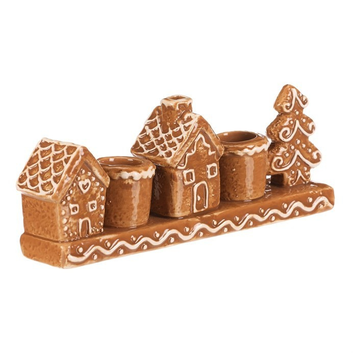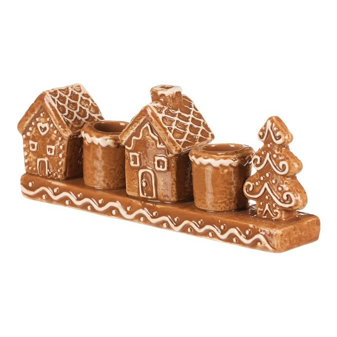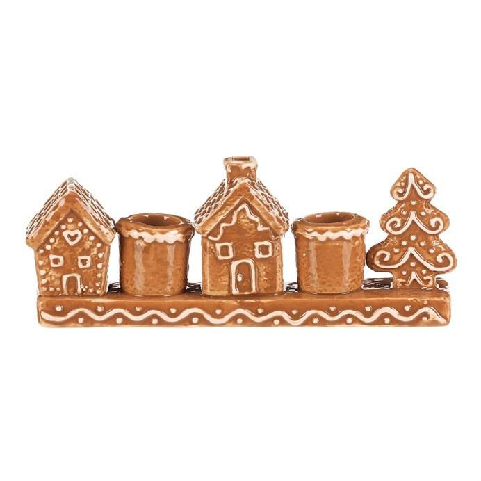 Krásný keramický svícen v perníkovém designu s bílou polevou, bude perfektní ozdobou pro čas Vánoc. Obsahuje celkem 2 kalíšky na vložení kónických svíček. Zbytek svícnu zdobí dva domky a jeden stromeček.