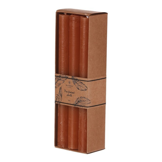 Užijte si romantické chvilky plné relaxace s medově zbarvenými kónickými svíčkami ze stoprocentního parafínového vosku. V balení najdete 6 kusů stejného odstínu, přičemž doba hoření každé z nich činí až 8 hodin. Tyto svíčky mají celoroční využití a přinesou do vašeho prostoru neodolatelnou atmosféru klidu a pohody. Užívejte si ty krásné okamžiky relaxace a romantiky při pohledu na nádherné světlo, zejména za temných večerů a nocí. Existuje nekonečně mnoho možností a způsobů, jak s nimi naložit. Můžou zdobit věnce, být součástí různých aranží, anebo jim vyberte nádherný svícen z naší široké nabídky, na kterém budou vypadat božsky. Ještě je nutné dodat, že se důrazně doporučuje skladovat svíčky, a tím spíše je zapálené vystavovat, mimo dosah dětí.