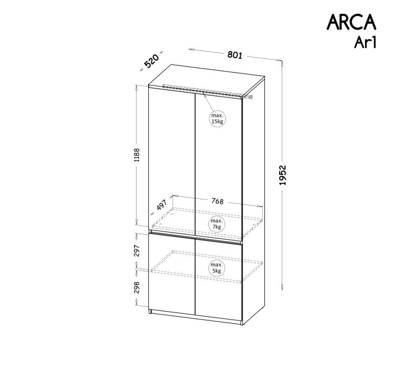 Šatní skříň Arca je základním prvkem vybavení pokoje pro mládež. Je prostorná a funkční , protože má v horní části tyč na ramínka a ve spodní části police. Toto uspořádání umožňuje lepší využití prostoru uvnitř a usnadňuje udržování pořádku .