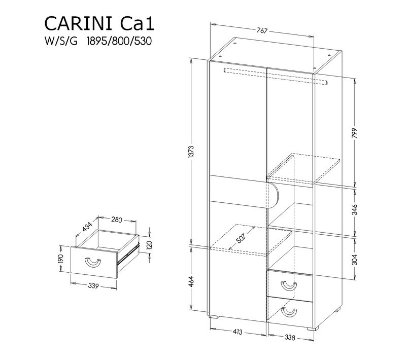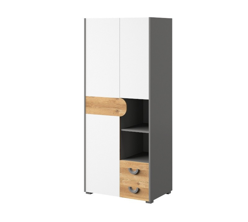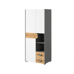 Dvoudveřová skříň se dvěma zásuvkami a otevřenou policí.