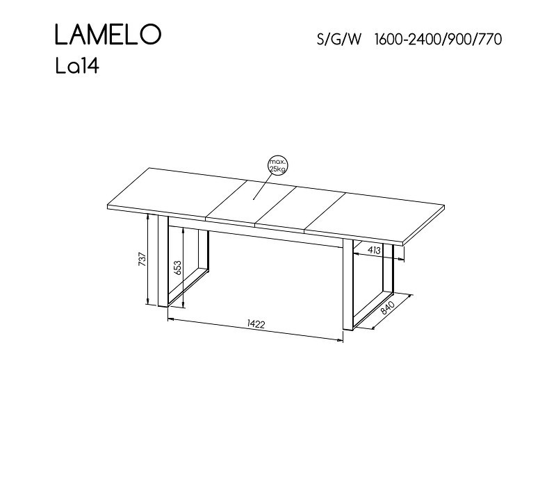 stůl lze zvětšit o 2 x vložky po 40 cm,
