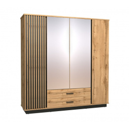 Čtyřdveřová skříň se zrcadly a dvěma zásuvkami.