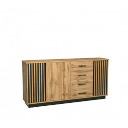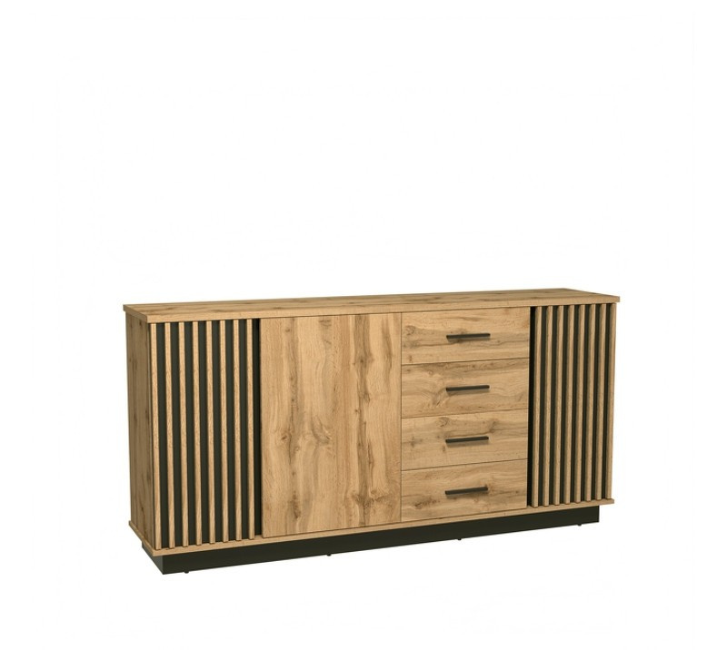 Komoda se třemi dveřmi a čtyřmi zásuvkami.
