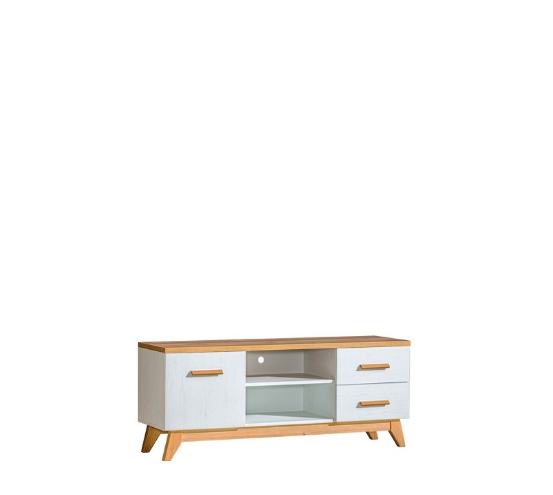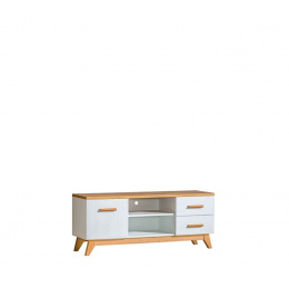 TV skříňka s jedněmi dveřmi, jednou policí a dvěma zásuvkami.