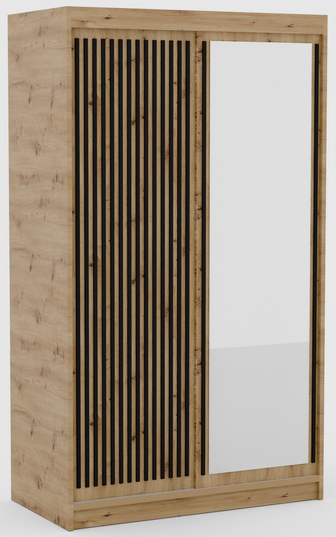 Šatní skříň Delia s posuvnými dveřmi a lamelami v barvách dřeva je stylové a praktické řešení pro ukládání oblečení a dalších předmětů ve vašem domě. Jeho elegantní design v dřevěných barvách dodává interiéru teplo a útulnost, zároveň se hodí k mnoha různým uspořádáním interiéru. Dveře skříně jsou vyrobeny z lamel, což jí dodává lehkost a modernost.