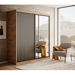 Šatní skříň Delia s posuvnými dveřmi a lamelami v barvách dřeva je stylové a praktické řešení pro ukládání oblečení a dalších předmětů ve vašem domě. Jeho elegantní design v dřevěných barvách dodává interiéru teplo a útulnost, zároveň se hodí k mnoha různým uspořádáním interiéru. Dveře skříně jsou vyrobeny z lamel, což jí dodává lehkost a modernost.
