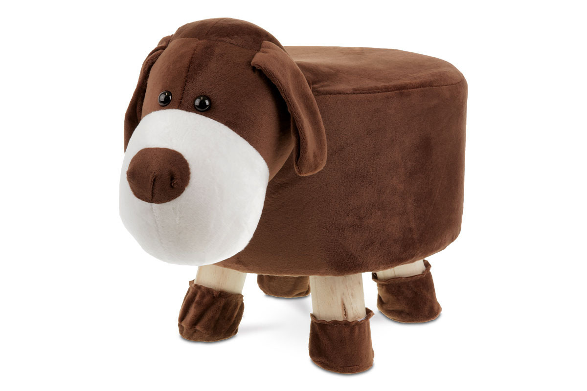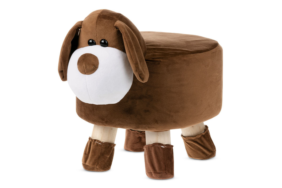 Taburet z modelové kolekce miniZOO ve tvaru psa je nejen praktickým a jedinečným doplňkem dětského pokoje, ale stane se i skvělým kamarádem na sezení i hraní pro Vaše dítě. Potah je kombinace hnědé a bílé látky mikroplyš. Kostra je z masivu, kombinovaného MDF deskou. Výplň z PU pěny. Nohy jsou z kaučukovníku v přírodním provedení. Nosnost taburetu je až 80 kg.