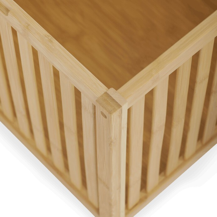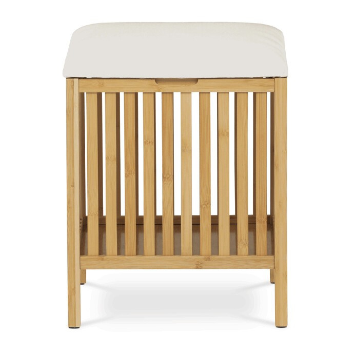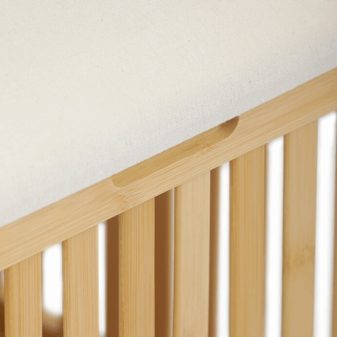 Koš na prádlo z masivního bambusu v přírodním odstínu kombinuje praktický úložný prostor s možností sezení díky polstrovanému sedáku v jemné bílé barvě. Bambusové lamely tvoří pevnou a vzdušnou základnu, která umožňuje cirkulaci vzduchu uvnitř koše. Polstrovaný sedák je potažený látkou, která se snadno udržuje a zvyšuje komfort při sezení. Díky svému přírodnímu vzhledu se hodí do různých interiérů, kde přináší přírodní atmosféru a funkčnost v jednom.