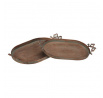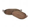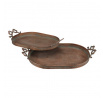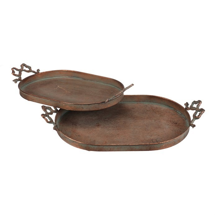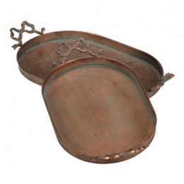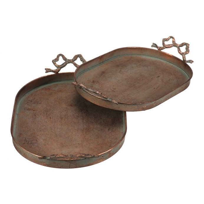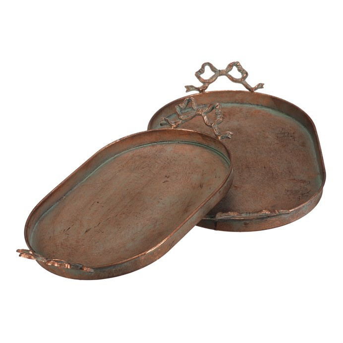 Sada dvou kovových táců v měděném odstínu zaujme svým oválným tvarem a dekorativními úchyty ve tvaru mašlí, které dodávají celku originální vzhled. Povrch táců má jemně patinovaný efekt, který podtrhuje vintage styl a zároveň usnadňuje údržbu. Tác je určený pro aranžování ozdob a květin, přičemž díky pevné kovové základně nabízí stabilitu při přenášení. Je ideální pro použití v interiérech s rustikálním nebo industriálním designem, kde vynikne jeho jedinečný vzhled.