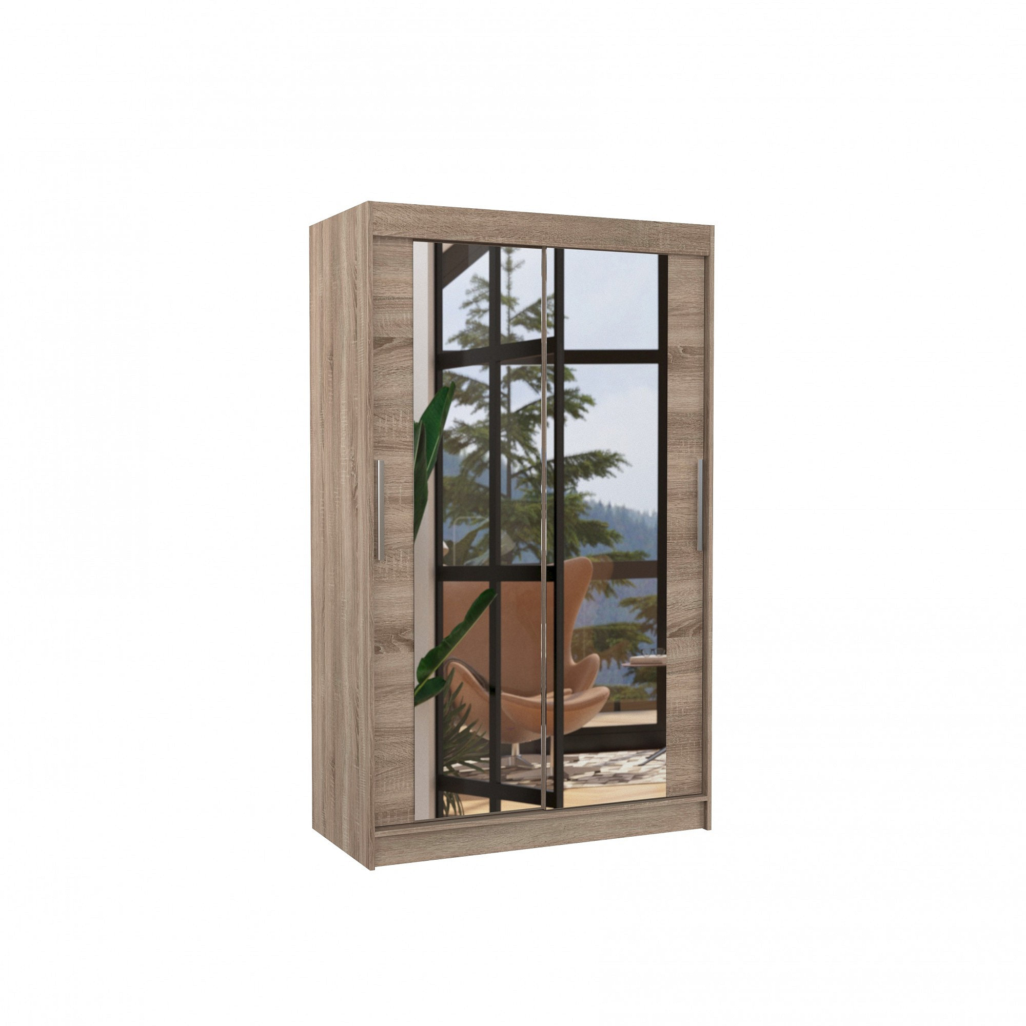 Šatní skříň s posuvnými dveřmi a zrcadlem TIBAGO je ideálním způsobem, jak uspořádat prostor. Nábytek je vybaven prostornými policemi a tyčí, na kterou můžete pověsit šaty, obleky, svrchní oděvy nebo košile. Na čelní stranu byla připevněna zrcadla, která opticky zvětšují prostor a zároveň dodávají jedinečný styl. Díky tomu, že skříň je posuvná, nemusíte vyčleňovat další místo na otevření dveří, což z ní činí ideální řešení pro malý pokoj nebo úzkou předsíň.