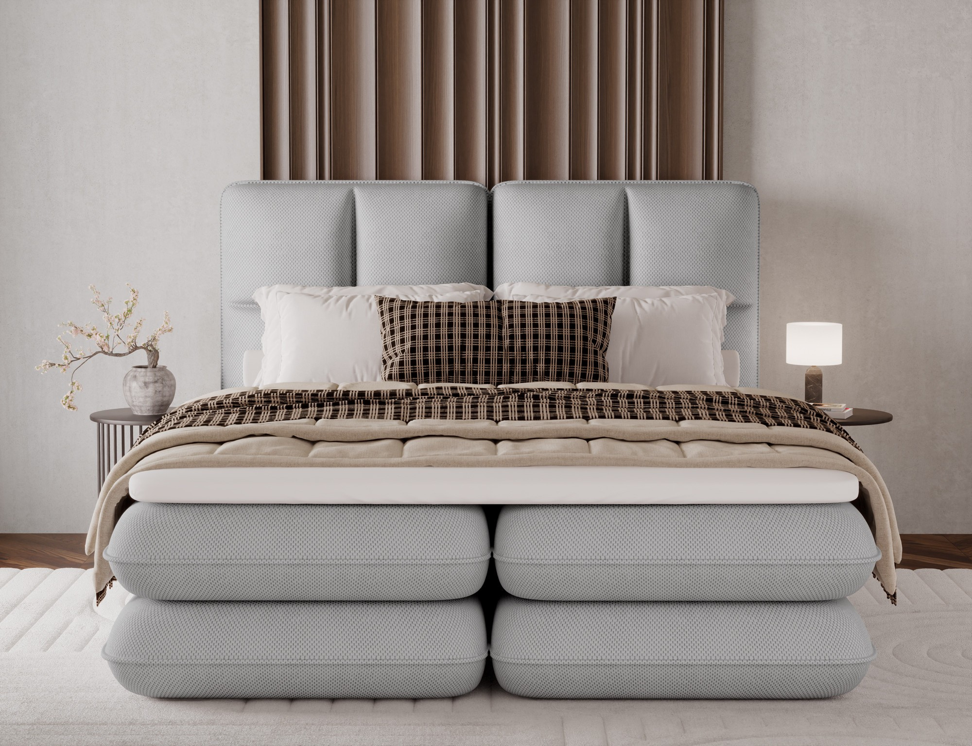 The Tonila bed is a modern and functional upholstered bed that combines sleeping comfort with practical solutions for the bedroom, making it an excellent choice for both contemporary and classic interiors; its solid construction with a height of 127 cm and a length of 235 cm ensures stability and comfortable back support, while the seat filling consisting of T2130 foam (storage box), bonell springs, and T2540 foam with a thickness of 2.5 cm provides proper body support and a high level of everyday comfort; the bed is equipped with a practical bedding storage compartment, which helps keep the bedroom organized, and the overall design is complemented by black furniture legs that add a modern and lightweight character; the Tonila model is available in three popular sizes: 140x200 cm, 160x200 cm, and 180x200 cm, allowing easy adjustment to the size of the room and individual needs, making it a comfortable, durable, and stylish bed for the bedroom.