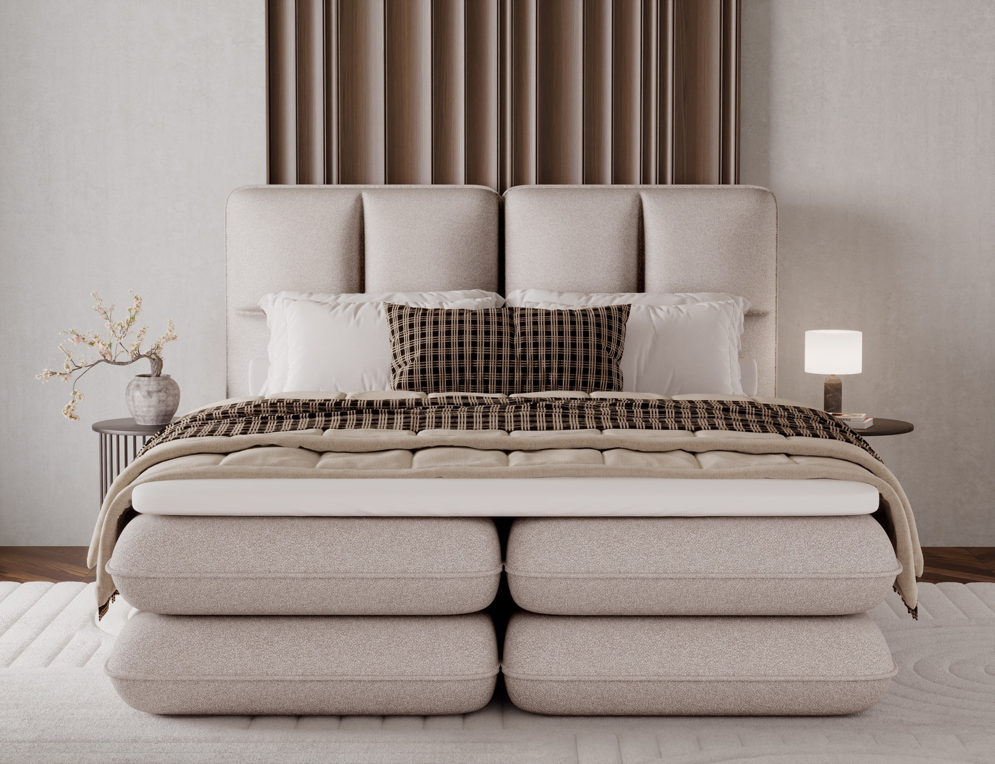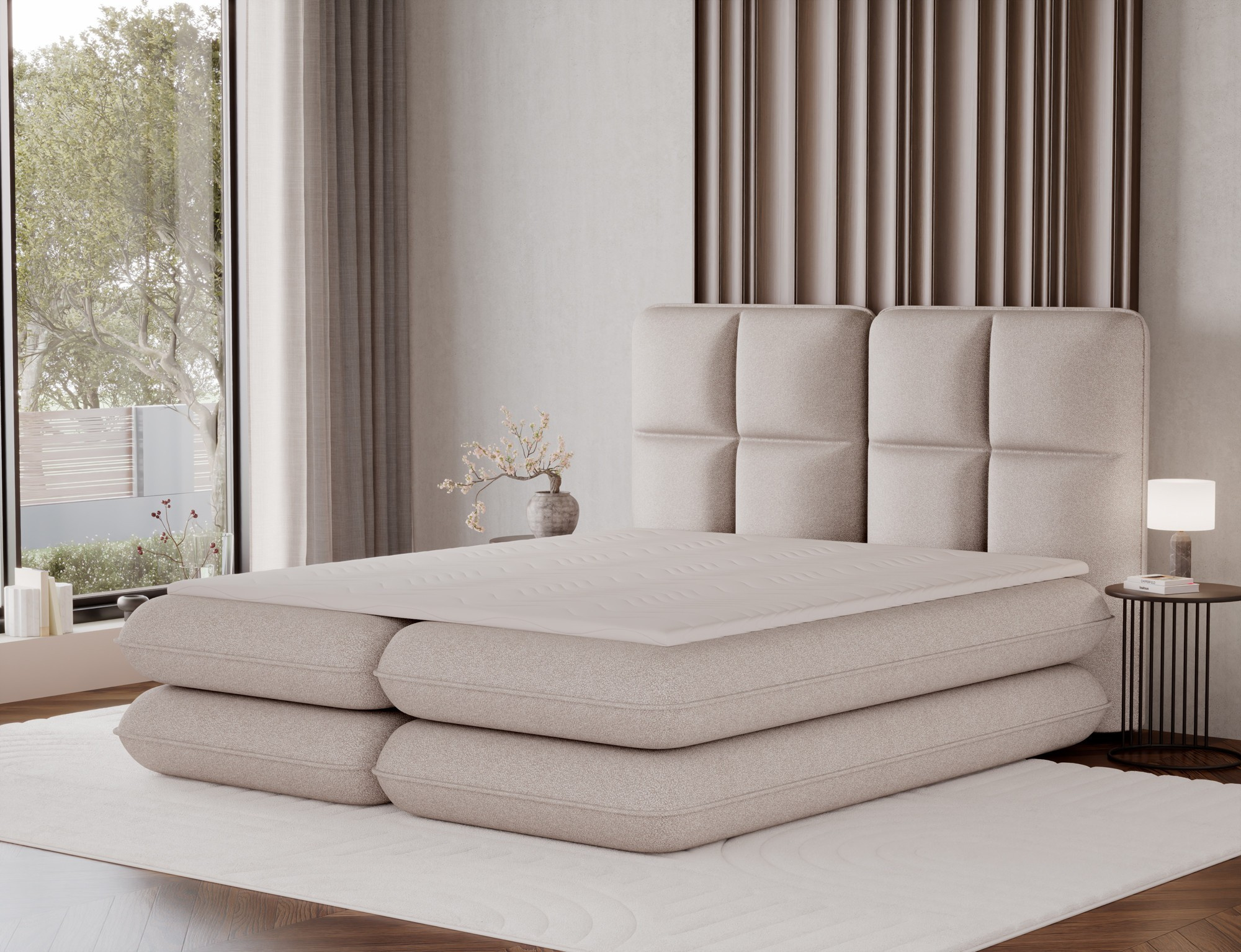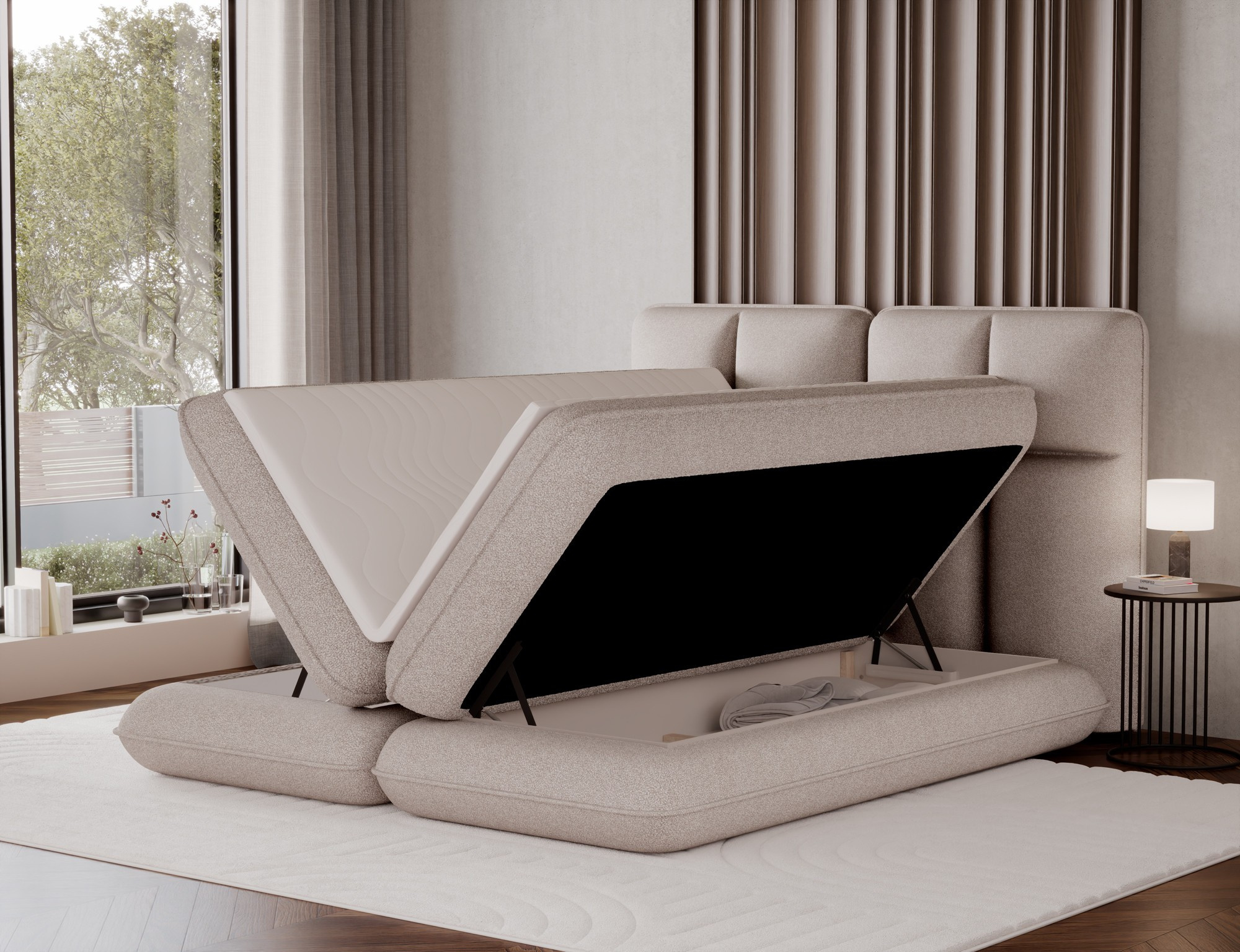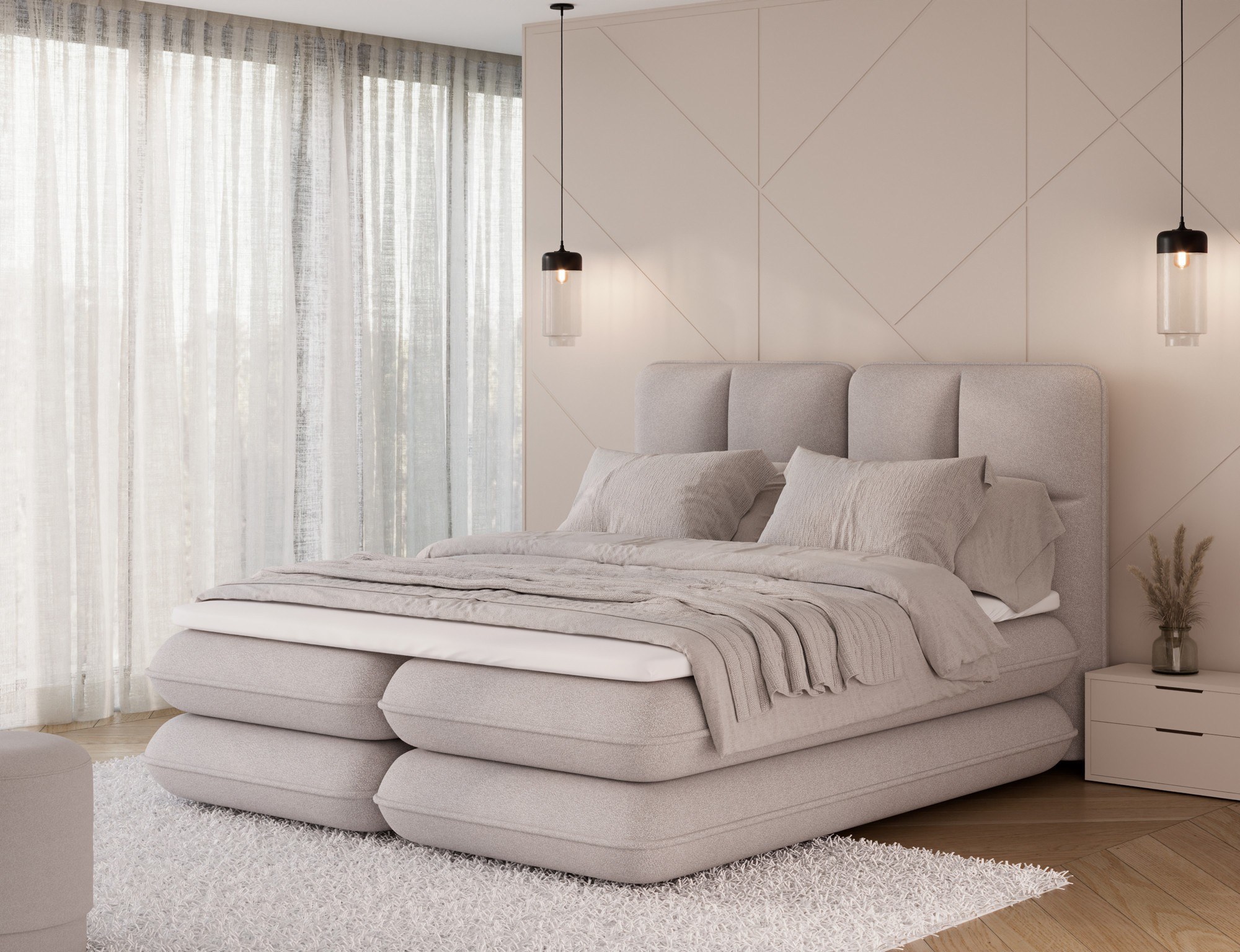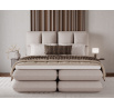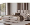 The Tonila bed is a modern and functional upholstered bed that combines sleeping comfort with practical solutions for the bedroom, making it an excellent choice for both contemporary and classic interiors; its solid construction with a height of 127 cm and a length of 235 cm ensures stability and comfortable back support, while the seat filling consisting of T2130 foam (storage box), bonell springs, and T2540 foam with a thickness of 2.5 cm provides proper body support and a high level of everyday comfort; the bed is equipped with a practical bedding storage compartment, which helps keep the bedroom organized, and the overall design is complemented by black furniture legs that add a modern and lightweight character; the Tonila model is available in three popular sizes: 140x200 cm, 160x200 cm, and 180x200 cm, allowing easy adjustment to the size of the room and individual needs, making it a comfortable, durable, and stylish bed for the bedroom.