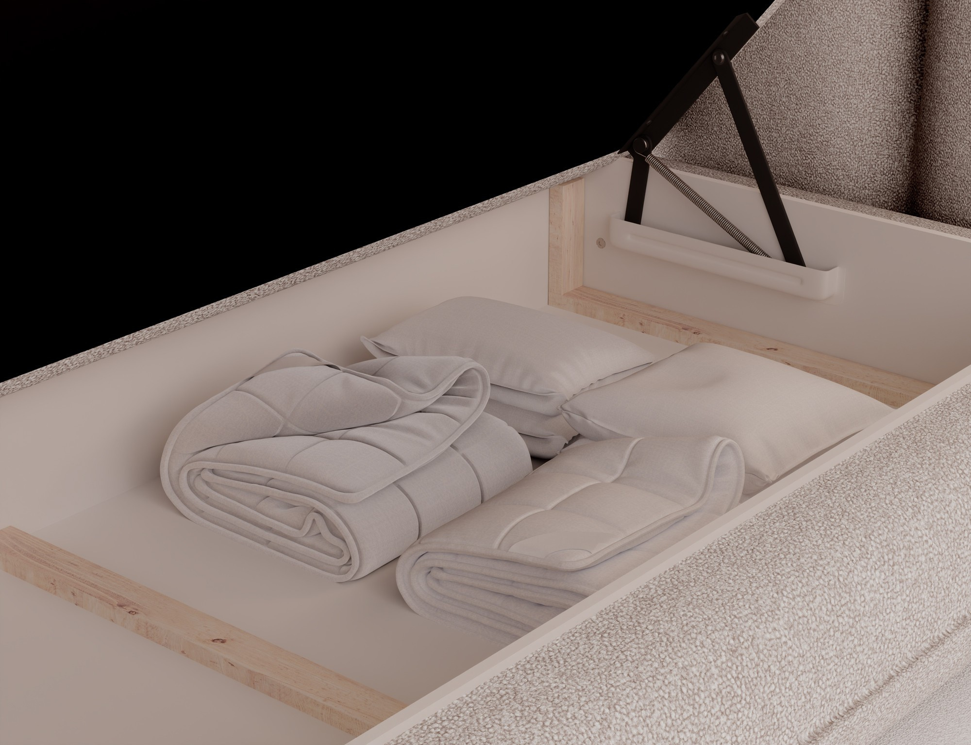 The Tonila bed is a modern and functional upholstered bed that combines sleeping comfort with practical solutions for the bedroom, making it an excellent choice for both contemporary and classic interiors; its solid construction with a height of 127 cm and a length of 235 cm ensures stability and comfortable back support, while the seat filling consisting of T2130 foam (storage box), bonell springs, and T2540 foam with a thickness of 2.5 cm provides proper body support and a high level of everyday comfort; the bed is equipped with a practical bedding storage compartment, which helps keep the bedroom organized, and the overall design is complemented by black furniture legs that add a modern and lightweight character; the Tonila model is available in three popular sizes: 140x200 cm, 160x200 cm, and 180x200 cm, allowing easy adjustment to the size of the room and individual needs, making it a comfortable, durable, and stylish bed for the bedroom.