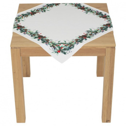 Ubrus s elegantním vzorem po obvodu zdobeným pruhem jehličí, šišek a bobulí na bílém podkladu přináší jemnou vánoční atmosféru. Vyrobený ze 100 % polyesteru, o rozměru 80 × 80 cm, snadno se udržuje a lze ho prát na 30 °C. Ideální dekorace na menší stoly i jako doplněk k větším ubrusům.
