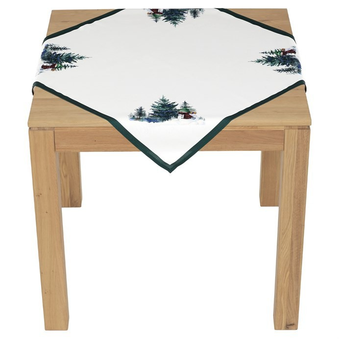Vánoční ubrus o rozměru 80 × 80 cm přinese na váš stůl příjemnou zimní atmosféru. Na bílém podkladu vynikají roztomilí sněhuláci a stromečky v rozích, které působí vesele a slavnostně. Vyrobený ze 100% polyesteru, snadno se udržuje a lze ho prát na 30 °C. Skvěle se hodí na menší stoly nebo jako dekorativní doplněk.
