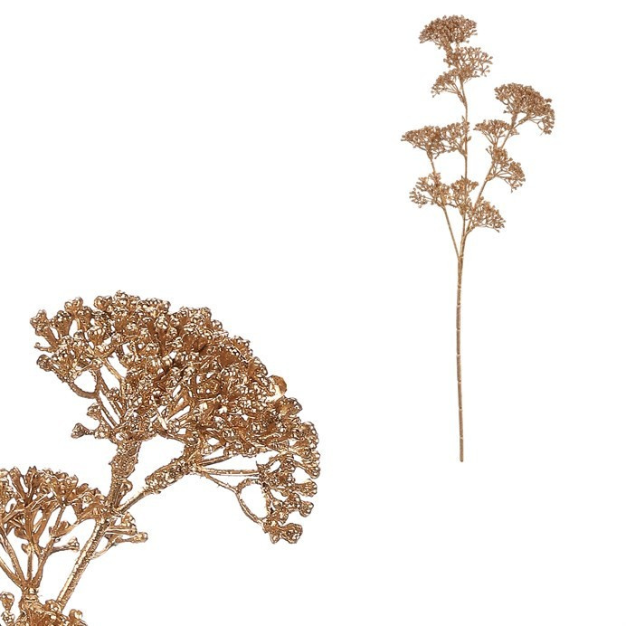 Umělá větev se zlatými drobnými květy přináší do interiéru elegantní dekorativní prvek. Vyrobena z plastu, nabízí dlouhou životnost a snadnou údržbu. Jemná struktura květů dodává větvi lehkost a působí přirozeně, což ji činí vhodnou pro aranžmá v květinových vazbách nebo samostatně v dekorativních nádobách.