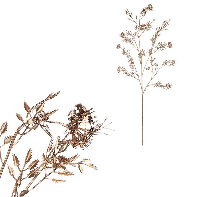 Umělá větev v elegantní zlaté barvě přináší do interiéru jemný dekorativní prvek s drobnými lístky a květy. Vyrobena z plastu, nabízí trvanlivost a snadnou údržbu bez potřeby zalévání. Větev je vhodná k aranžování do vázy nebo jako součást dekorací, které oživí každý prostor teplým a stylovým akcentem.