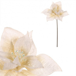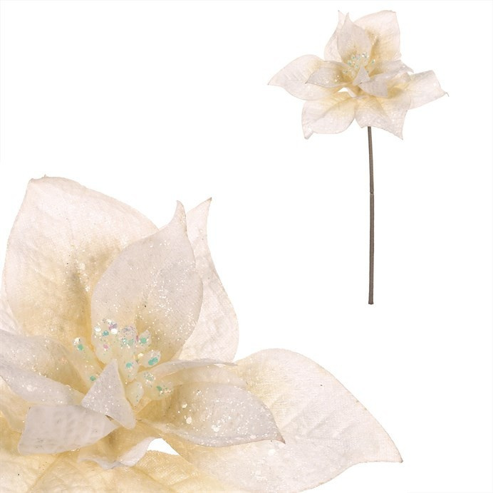 Umělý květ vánoční růže na stonku přináší kouzlo sváteční atmosféry. V bílém provedení se třpytkami působí jemně a slavnostně. Ideální pro zimní aranžmá nebo jako působivý doplněk dekorací.