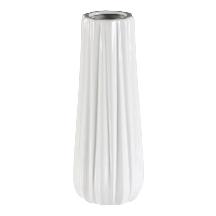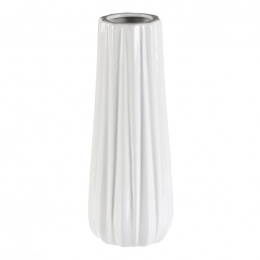 Keramická váza v bílé barvě s jemnými svislými vlnkami na povrchu, přináší do vašeho prostoru sofistikovanou eleganci. Její jemný a postupně se zužující tvar, v kombinaci s jednolitým barevným provedením, skvěle doplní jakýkoli vybraný prostor a vytvoří neodolatelné aranžmá, ať už s květinami, nebo jinými dekoracemi.