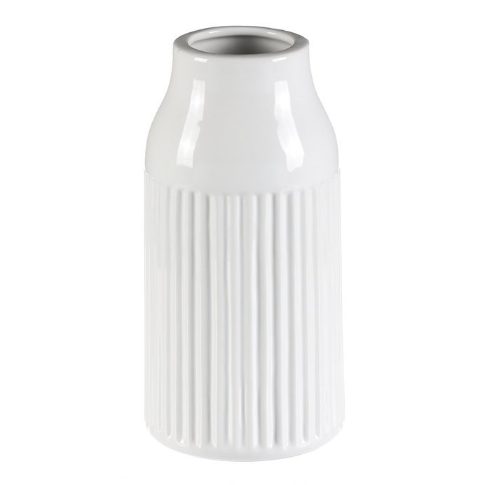 Keramická váza v bílé glazované barvě se zúženým hrdlem a jemným vzorem svislých vlnek na povrchu, dodá vašemu interiéru elegantní a sofistikovaný vzhled. Jednobarevné provedení a hladký design z ní činí univerzální dekoraci a skvělý základ pro oblíbené květiny. Hodí se tak do jakéhokoli prostoru, ať už na stůl, poličku nebo komodu.