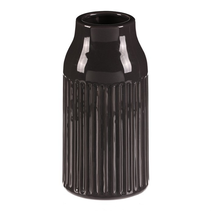 Keramická váza v antracitově šedé glazované barvě se zúženým hrdlem a jemným vzorem svislých vlnek na povrchu, dodá vašemu interiéru elegantní a sofistikovaný vzhled. Jednobarevné provedení a hladký design z ní činí univerzální dekoraci a skvělý základ pro oblíbené květiny. Hodí se tak do jakéhokoli prostoru, ať už na stůl, poličku nebo komodu.