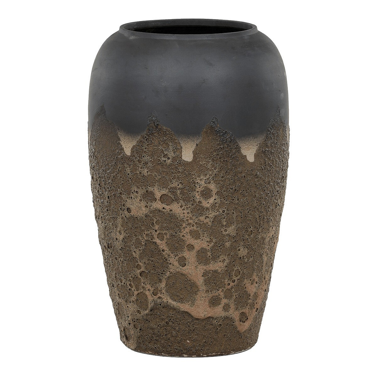 Keramická váza o výšce 70 cm zaujme kombinací šedo-hnědých tónů a kontrastních povrchů. Horní zaoblená část je hladká a šedá, zatímco spodní část v odstínech hnědé má hrubší texturu. Tento elegantní kus skvěle doplní jakýkoli interiér a je ideálním základem i pro větší a robustnější rostliny.