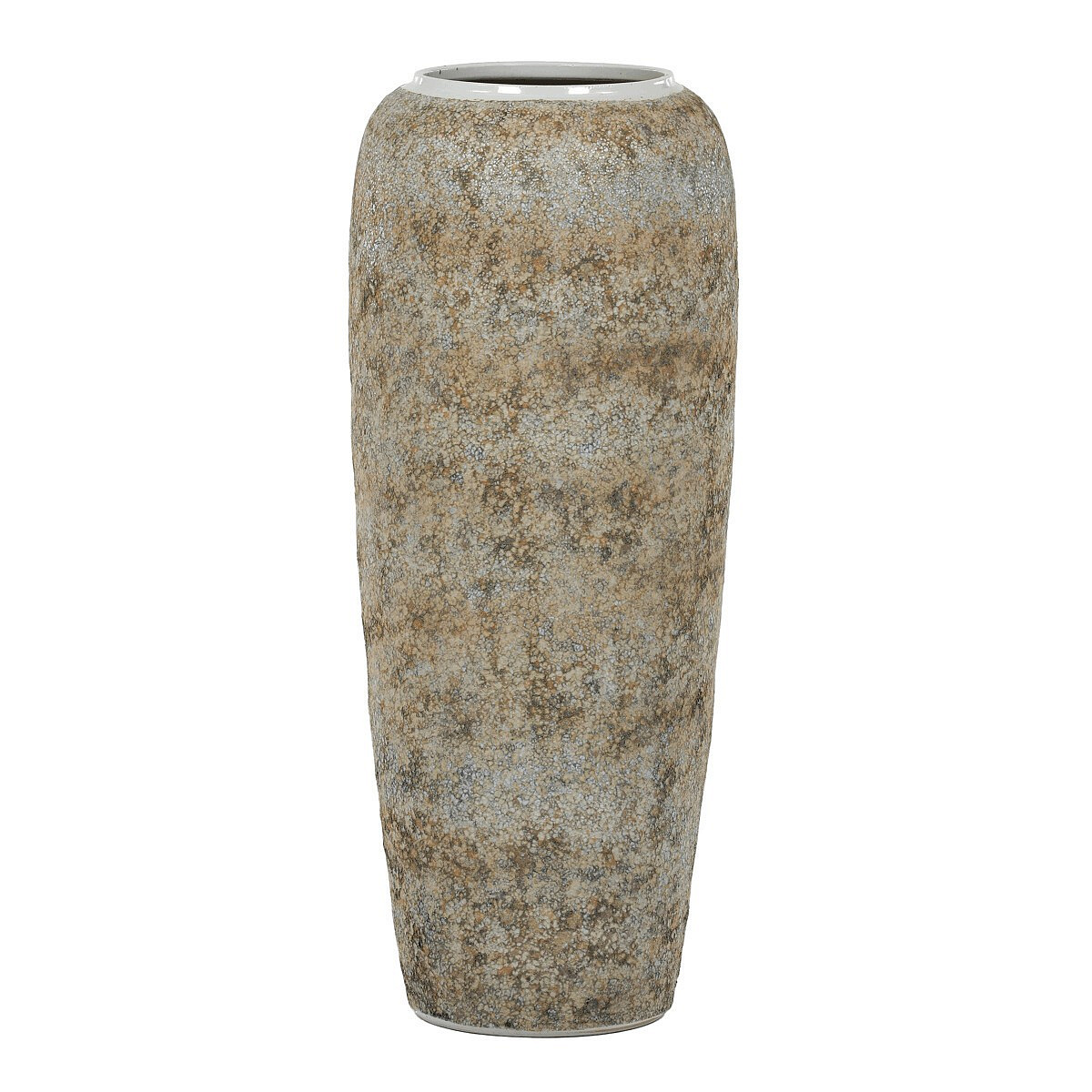 Keramická váza o výšce 90 cm v šedo-béžové kombinaci s výrazným zrnitým barevným povrchem přináší do interiéru nádech starověku. Střídání odstínů hnědé, béžové a šedé tvoří zajímavý efekt, zatímco mírně zaoblený tvar evokuje vzhled historické nádoby. Skvělá volba pro větší rostliny a květiny, které v ní krásně vyniknou.
