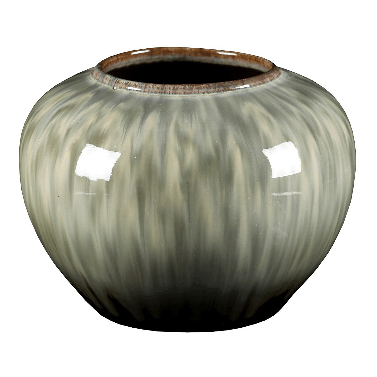 Keramická váza o výšce 20 cm zaujme zaobleným, vypouklým tvarem a lesklým povrchem s jemným žíháním v různých odstínech šedé. Svým designem připomíná antickou nádobu a zároveň evokuje dojem lesklého kamenného povrchu. Elegantní doplněk, který vynikne s rostlinami i jako samostatná dekorace.