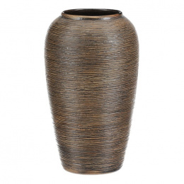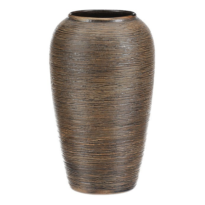 Keramická váza o výšce 26 cm zaujme zaobleným tvarem a hnědým povrchem s vodorovnými rýhami, které jí dodávají starobylý vzhled. Jako by ji právě vykopali samotní archeologové! Skvěle doplní váš interiér a nechá zasazené rostliny nádherně vyniknout.