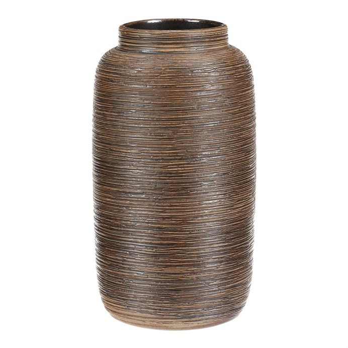 Keramická váza o výšce 30 cm zaujme jemně zaobleným tvarem, užším hrdlem a hnědým povrchem s vodorovnými rýhami, které jí dodávají starobylý vzhled. Jako by ji vyrobili samotní antičtí mistrové. Skvěle doplní váš interiér a nechá zasazené rostliny nádherně vyniknout.