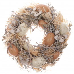 Věnec s proutím, umělými vajíčky a peřím, velikonoční dekorace