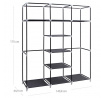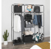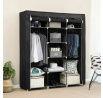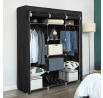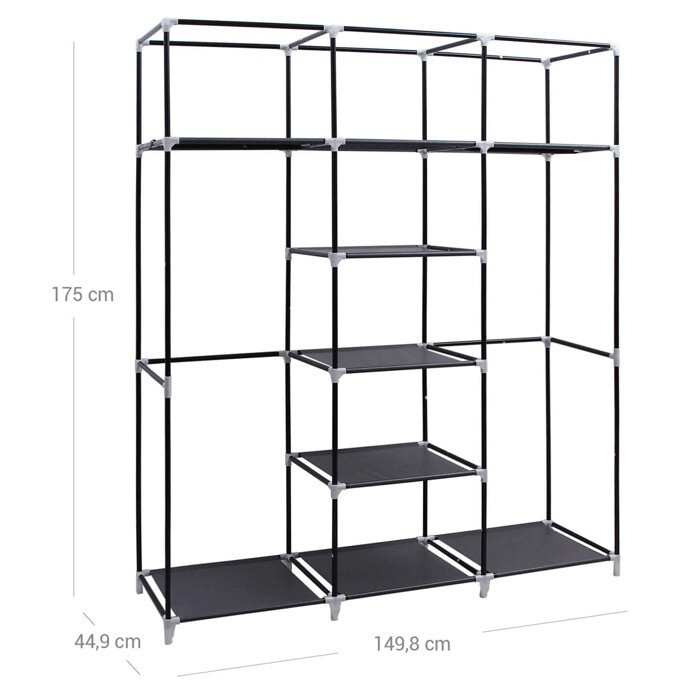 Látková šatní skříň v černém provedení nabízí praktické řešení úložného prostoru pro oděvy a doplňky. Její pevná kovová konstrukce zajišťuje stabilitu a dlouhou životnost, zatímco černá látka chrání obsah před prachem a nečistotami. Skříň je vybavena třemi závěsnými tyčemi pro zavěšení oblečení a třemi policemi uprostřed pro uložení složených věcí nebo krabic. Přední část lze jednoduše stáhnout pomocí rolovacích pásků, což umožňuje rychlý přístup k obsahu. Díky kompaktním rozměrům a lehké konstrukci je vhodná do menších prostor i jako doplňkový úložný systém.