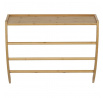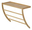 Nástěnná police z masivního bambusu v přírodním odstínu kombinuje funkčnost s přírodním vzhledem. Její elegantní obloukový tvar a dvě vodorovné tyče pod policí umožňují praktické zavěšení drobných předmětů nebo textilií. Povrch bambusu je hladký a snadno udržovatelný, což zajišťuje dlouhou životnost a přirozený vzhled. Police je vhodná pro umístění v chodbě, koupelně nebo obývacím pokoji, kde poslouží jako stylový a praktický doplněk interiéru.