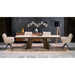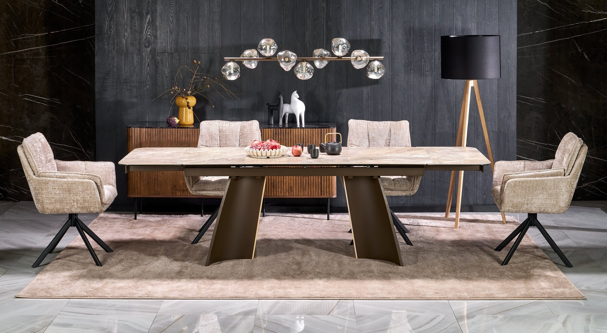 rozměry: 180-260/90/76 cm, stůl rozkládací, materiál: keramika / sklo / ocel lakovaná práškovou barvou / masivní dřevo, barva: deska - béžový mramor, noha - hnědá